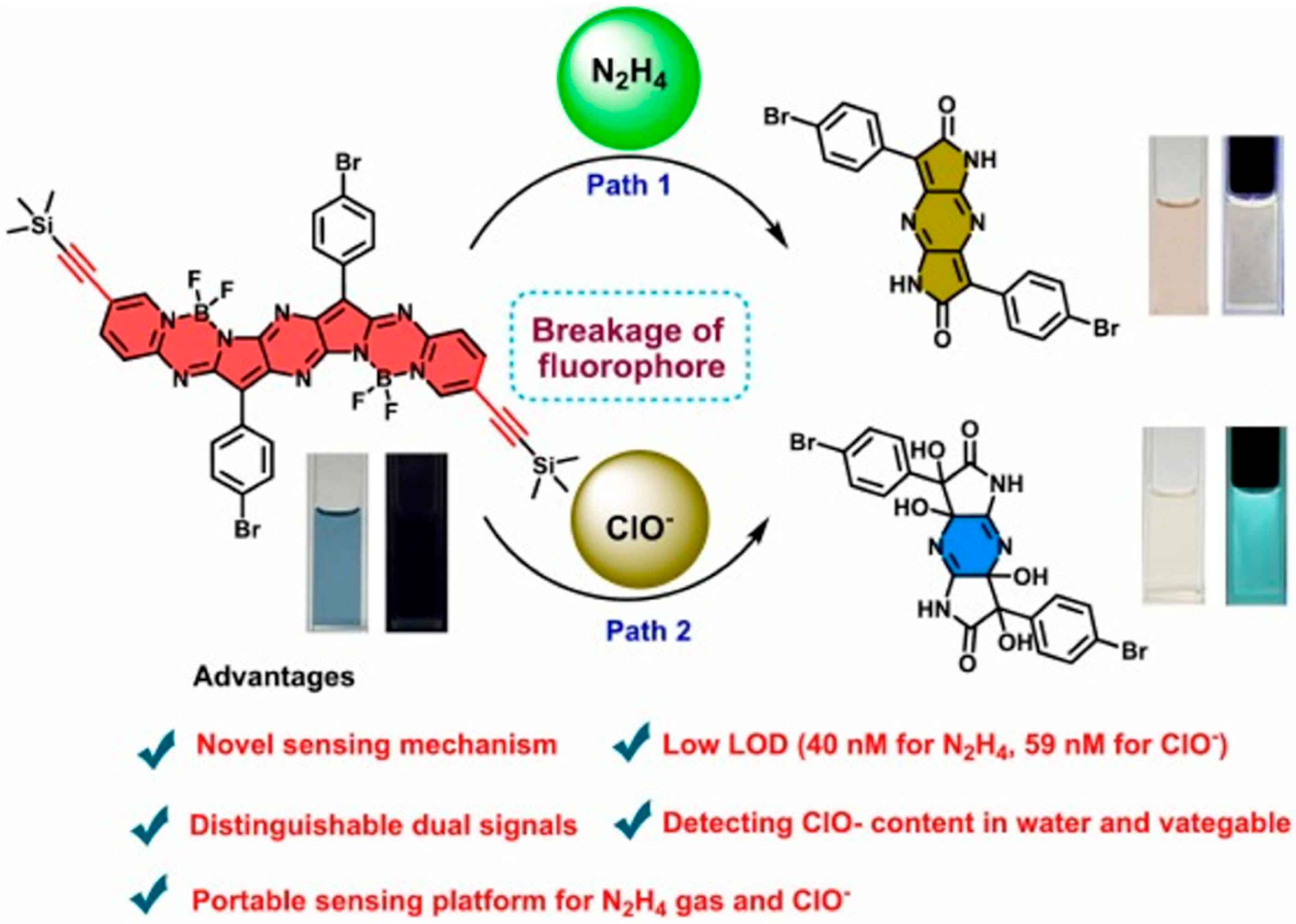 - Zhang, Y.; Gan, Y.; Lai, B.; Ran, X.; Cao, D.; Wang, L. A portable sensing platform using a novel dipyrrolopyrazinedione-based aza-BODIPY dimer for highly efficient detection of hypochlorite and hydrazine. Spectrochim. Acta A Mol. Biomol. Spectrosc. 2025, 341, 126415. [Google Scholar] [CrossRef]
