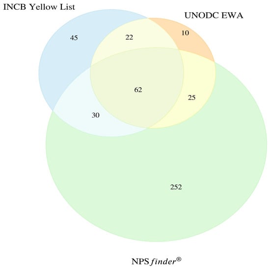 The Venn diagram in Figure 4 shows the overlap of detections between the three international EWSs with the highest number of NSOs detected, INCB Yellow List, UNODC EWA, and NPSfinder®. Only 62 substances (14%) were detected by all three EWSs. NPSfinder® showed the greatest detection capacity by identifying an overall total of 369 NSOs with 252 unique detections. The INCB Yellow List followed with 159 NSOs, while UNODC EWA recorded 119 substances in total.