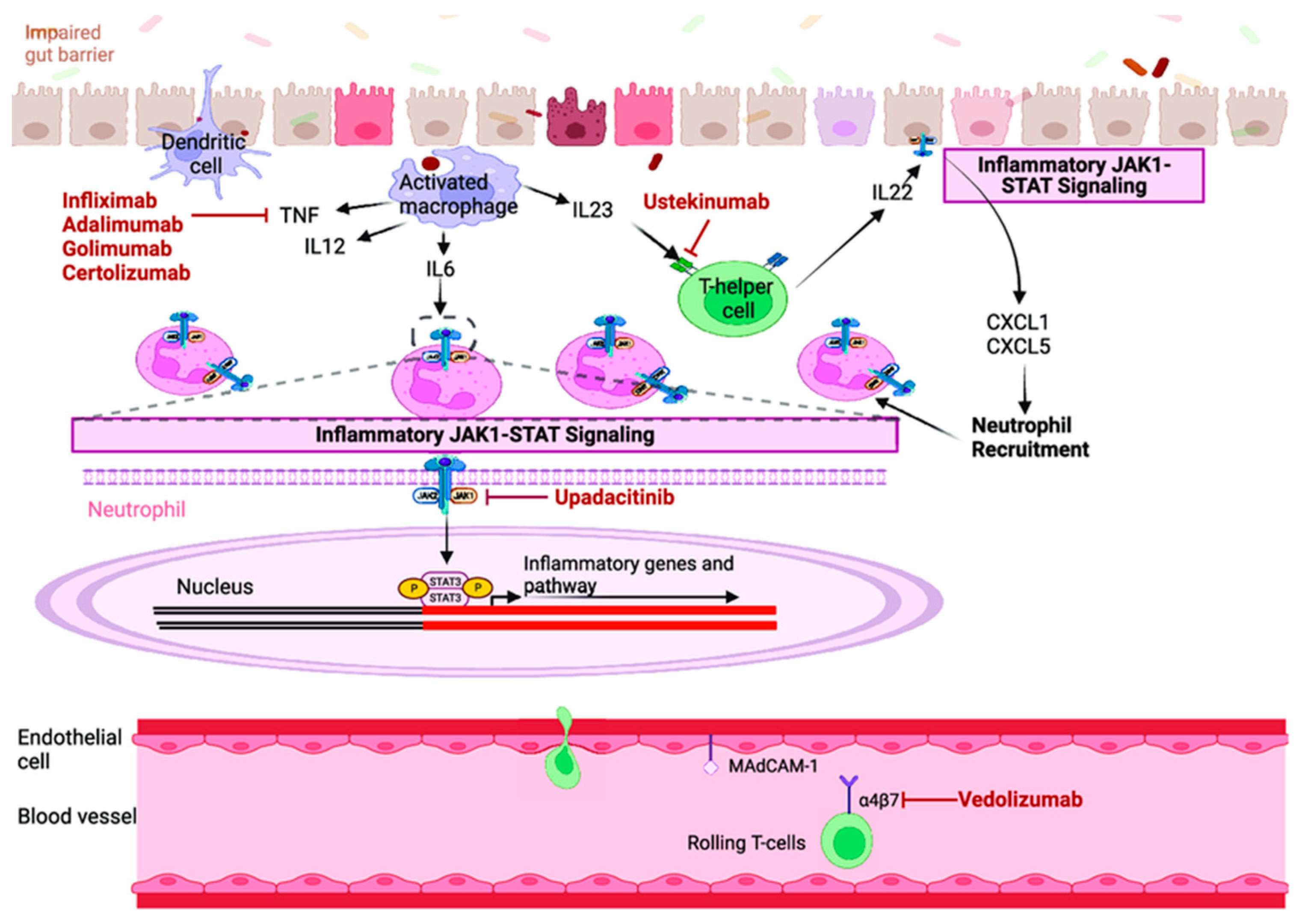 - Pérez-Jeldres, T.; Tyler, C.J.; Boyer, J.D.; Karuppuchamy, T.; Bamias, G.; Dulai, P.S.; Boland, B.S.; Sandborn, W.J.; Patel, D.R.; Rivera-Nieves, J. Cell Trafficking Interference in Inflammatory Bowel Disease: Therapeutic Interventions Based on Basic Pathogenesis Concepts. Inflamm. Bowel Dis. 2019, 25, 270–282. [Google Scholar] [CrossRef]