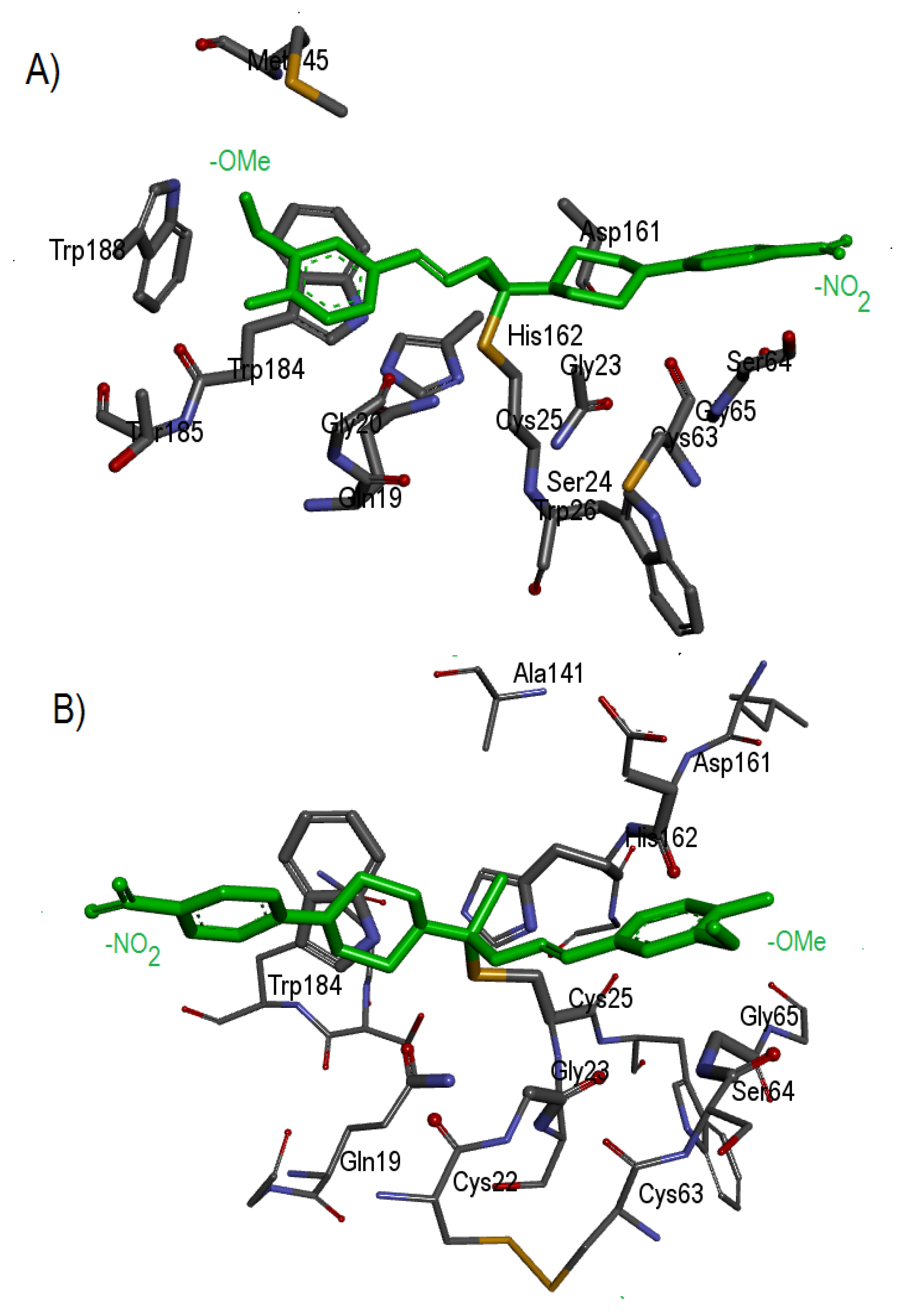| Comp. | Epimastigote EC50 (µM) 1 | Trypomastigote Viability at 20 µM (%) 2 | CZP Residual Activity at 100 µM (%) 3 | cTXNPx Residual Activity at 100 µM (%) 3 | TcGPx-I Residual Activity at 100 µM (%) 3 | ΔG R-Pose (kcal/mol) 4 | ΔG S-Pose (kcal/mol) 4 |