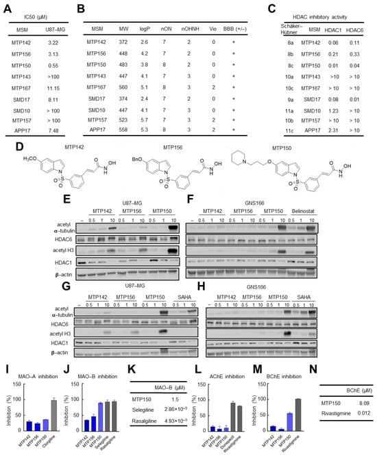 Novel MSMs are cytotoxic for GB and inhibit target genes. (A) IC50 values of the compounds of the novel family of MSMs in the U87 cell line. (B) Table summarizing the physicochemical properties of the four MSMs and their predicted ability to cross the BBB. (C) IC50 values of novel MSMs for HDAC1 and HDAC6. (D) Chemical structure of the three MTP molecules. (E–H) Representative Western blot of HDAC6 and HDAC1 and their targets acetylated α-tubulin and acetylated H3 in (E–G) U87-MG and (F–H) GNS166 cells treated with increasing concentrations of MTP142, MTP156, MTP150 and Belinostat or SAHA. (I–K) MAO-A and MAO-B inhibitory capacity of MTP142, MTP156 and MTP150. (L,M) AChE and BChE inhibitory capacity of MTP142, MTP156 and MTP150, (N) BChE IC50 values of MTP150 and the reference compound Rivastigmine.