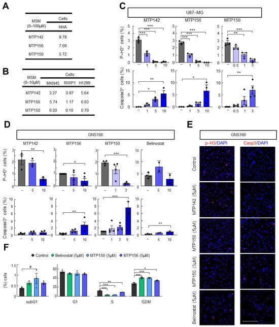 Novel MTP compounds present antitumor activity. (A) IC50 values of MTP142, MTP156 and MTP150 in NHA. (B) IC50 values of MTP142, MTP156 and MTP150 in MKN45, RWP1 and H1299 cell lines. (C) Quantification of phospho-Histone 3 and cleaved Caspase 3 marker after the administration of increasing concentrations of MTP142, MTP156 and MTP150 in the U87 cell line (D) Quantification of phospho-Histone 3 and cleaved Caspase 3 marker after the administration of increasing concentrations of MTP142, MTP156 and MTP150 in GNS166 cells. (E) Representative images of p-H3 and Casp3 markers in GNS166 cells. Scale bar of 200 μm. (F) Flow cytometry analysis of GNS166 treated with 5 μM MTP156, MTP150 or Belinostat. # p ≤ 0.1, * p ≤ 0.05; ** p ≤ 0.01; *** p ≤ 0.001.