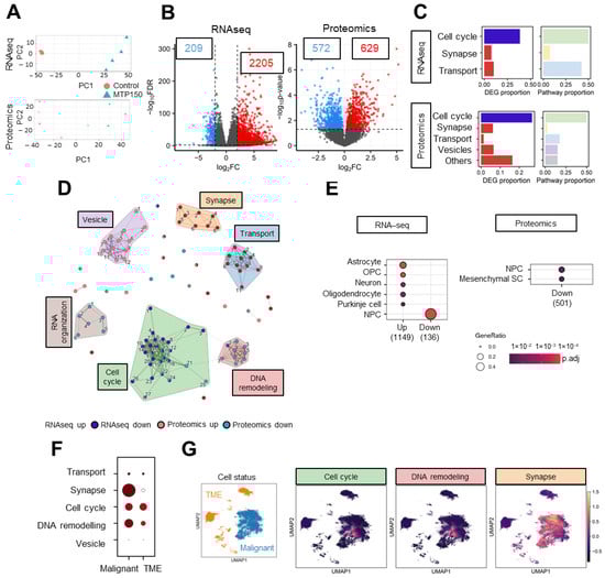 MTP150 impairs cell cycle, DNA remodeling and synapse in GSCs. (A) PCA plot of RNAseq and proteomics studies. (B) Volcano plot of RNAseq and proteomics using a fold-change > 4 and p-value < 0.01 for RNAseq, and p-value < 0.05 for proteomics. (C) Proportion of DEGs and biological processes represented by the biological themes in RNAseq and proteomic studies, respectively. (D) Enrichment map representing the connection between pathways associated with DEGs and DEPs in RNAseq and proteomic studies, respectively. The width of the connecting bars indicates the number of genes that are shared between the two pathways. (E) Human cell type marker ORA from RNA-seq and proteomic studies, based on data from the CellMarker database. Gene ratio goes from 0.0 to 0.4 and the p adjust until 1 × 10−2. (F,G) Uniform Manifold Approximation and Projection (UMAP) visualization displaying the predefined cellular states from the original study, segmented into malignant cells and the tumor microenvironment (TME), and UMAP visualization of the GBMspace dataset depicting the mean module scores derived from the genes commonly differentially expressed (DEGs) within the cell cycle cluster defined by the MTP150 multi-omic analyses.