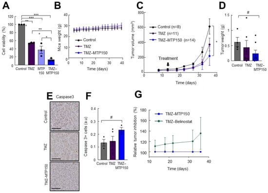 Next, the effect of MTP150 was tested in combination with TMZ. For in vitro experiments, 250 µM TMZ and 0.5 µM MTP150 were used and the results revealed that both compounds alone significantly reduced cell viability compared to untreated cells. However, the reduction was significantly enhanced when both agents were combined. Cell viability decreased to 15%, compared with 55% and 37% for TMZ and MTP150 alone, respectively, as measured by the MTT assay (Figure 6A). We then moved to the in vivo setting and combined MTP150 with TMZ. We evaluated the weight of animals, showing no toxicity effect in mice due to the low dose of the compounds (Figure 6B). As expected, and consistent with previous reports, TMZ alone reduced tumor volume compared to controls (Figure 6C). Noteworthy, the antitumor effect was further increased when combined with MTP150. Tumors treated with TMZ alone had an average volume of ~580 mm3, while the TMZ + MTP150 combination reduced tumor volume to ~445 mm3, corresponding to reductions of ~50% versus control and ~25% versus TMZ alone, respectively (Figure 6C). In addition, tumor weights from the combined treatment group were nearly 50% lower than controls (Figure 6D). Immunohistochemical staining revealed that tumors treated with the combination of TMZ + MTP150 displayed increased cleaved Caspase 3-positive cells compared to other groups (Figure 6E,F). Finally, the comparison of MTP150 with Belinostat treatment demonstrated that MTP150 exerted greater antitumor activity both as monotherapy and in combination with TMZ (Figure 6G). These results reveal the potent antitumor activity of MTP150 MSM alone and in combination with TMZ.