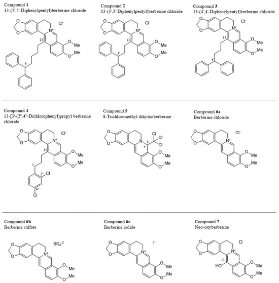 In the third part of the current study, we extended our investigations from berberine chloride to eight other berberine derivatives: 13-(5′,5′-diphenylpentyl) berberine chloride (compound 1), 13-(3′,3′-diphenylpropyl) berberine chloride (compound 2), 13-(4′,4′-diphenylbutyl) berberine chloride (compound 3), 13-[3′-(2,4-dichlorophenyl)propyl] berberine chloride (compound 4), 8-trichloromethyldihydroberberine (compound 5), and neo-oxyberberine (compound 7) as drawn in Figure 5. Three of the compounds are salts of berberine, numbered as 6a (chloride), 6b (sulfate), and 6c (iodide). All of these will be converted to berberine once they enter the cells.
