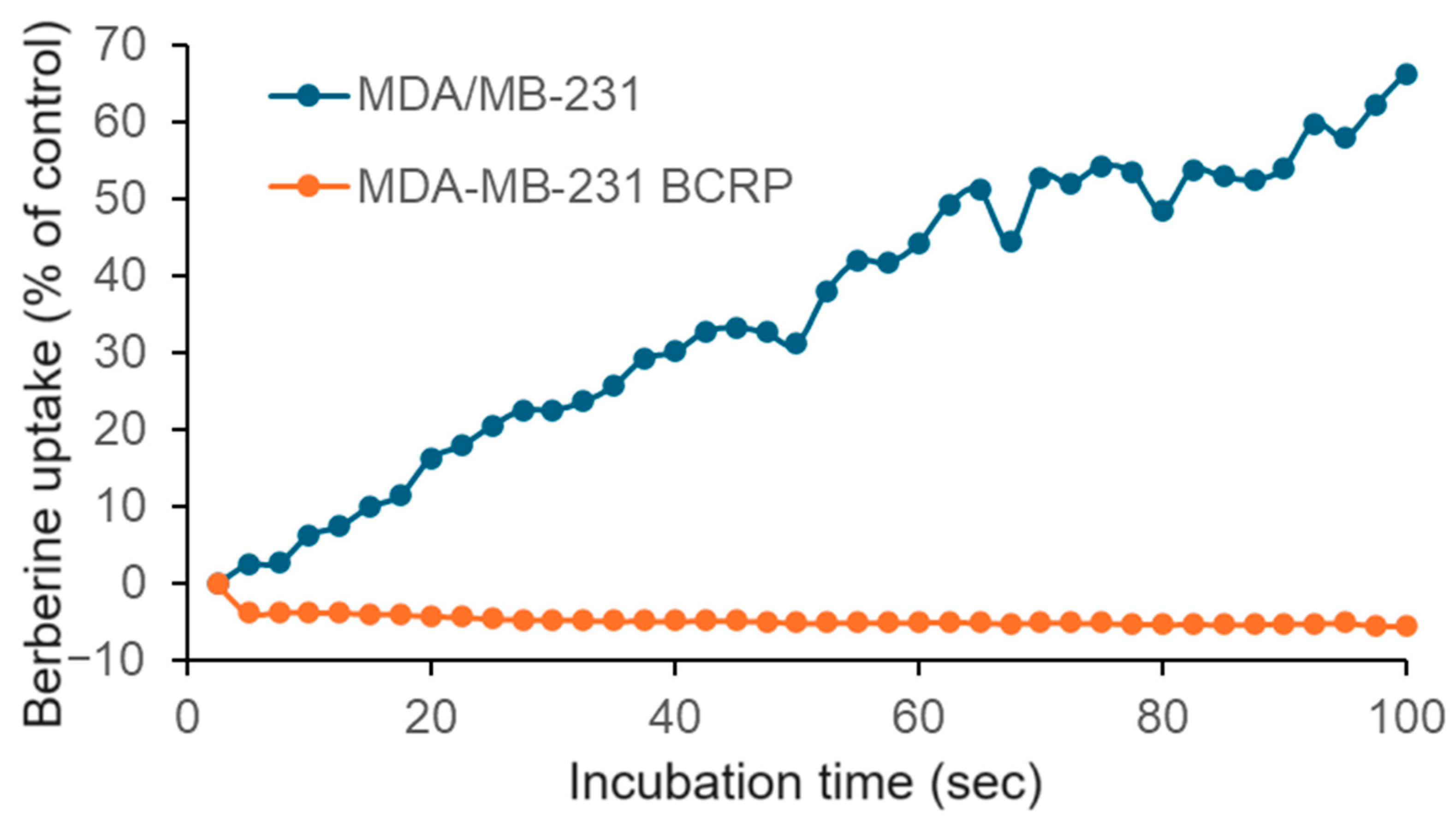 We performed a berberine uptake assay to study whether berberine is a substrate of BCRP. For this purpose, MDA-MB-231 breast cancer cells and their transfectant subline MDA-MB-231-BCRP clone 23 were treated with 1 µM berberine. Image series were automated in time intervals of 2.5 s with the Improvision Openlab system (versions 3.1.4, 3.1.7, or 3.5.2) in brightfield and fluorescence mode (Ex *; Em *) with an Axiovert S100TV inverted microscope (Zeiss, Oberkochen, Germany), equipped with an LD Achromat 20× 0.4 objective and a Hamamatsu CCD C4742-95 camera (Hamamatsu Photonics Deutschland GmbH, Herrsching am Ammersee, Germany). With increasing fluorescence intensity, the first image was used as the background image, and a background value was subtracted from all subsequent images. Descending image sequences were not processed. After conversion into TIF format, the gray values of the fluorescence images were analyzed with the NIH software Image J134 (https://imagej.net) and displayed graphically with the SigmaPlot software https://sigmaplot.en.softonic.com/ (version 13, Systat Software GmbH, Frankfurt, Germany). This experiment was enabled by the fact that berberine chloride is a naturally yellow-colored compound, whose cellular uptake can be observed by live cell microscopy.