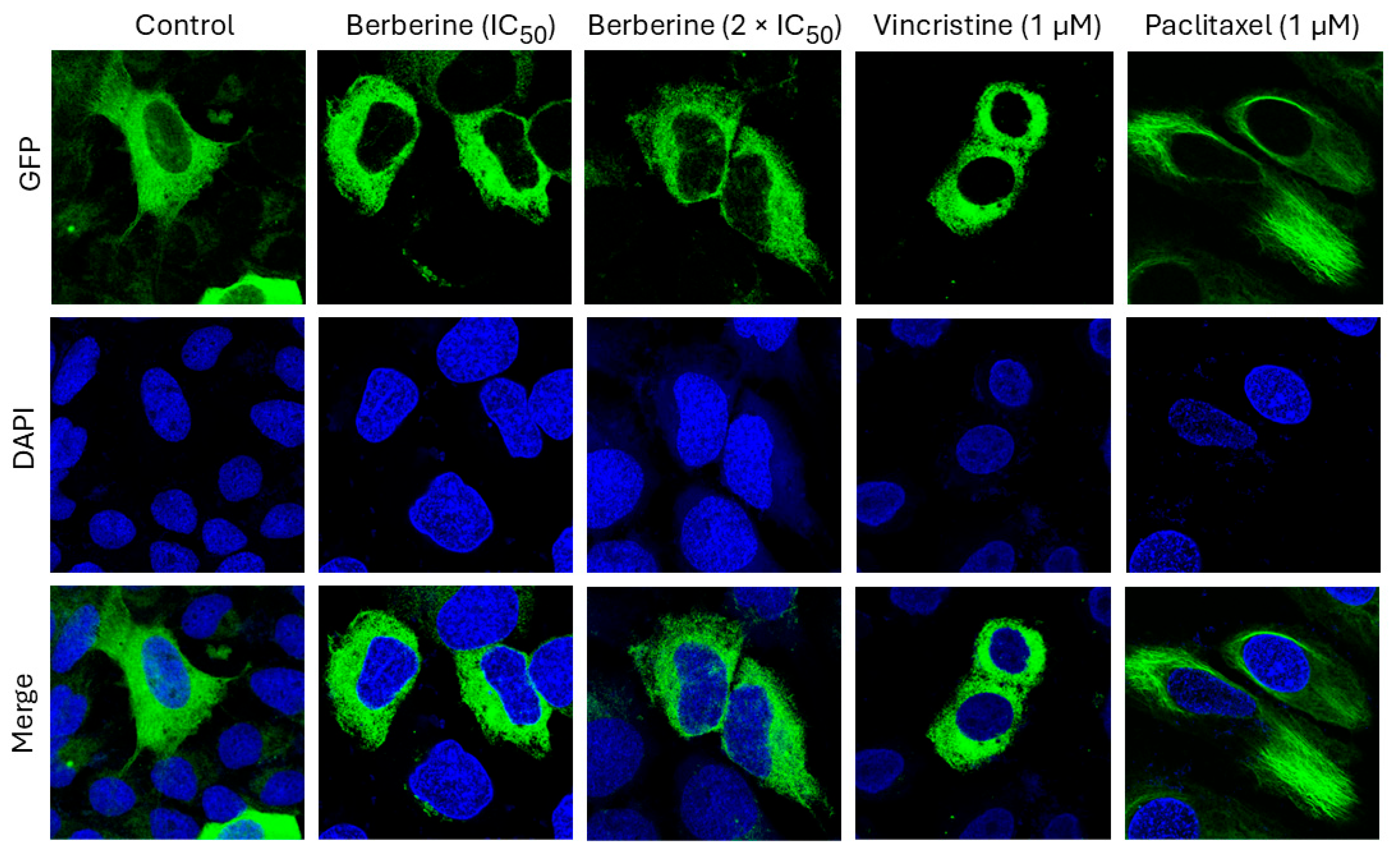 U2OS human osteosarcoma cells transfected with an α-tubulin-GFP construct (30,000 cells/well) were seeded in a µ-Slide 8-Well (ibidi, Gräfelfing, Germany). The cells were provided by Dr. Joachim Hehl (Light Microscope Center, ETH Zürich, Zürich, Switzerland). The cells were allowed to attach overnight in a 37 °C incubator with 5% CO2. Then, the cells were treated with IC50 and 2 × IC50 values of berberine chloride on wild-type U2OS cells. DMSO was used as a negative control. Vincristine (1 µM) was used as a positive control that obstructs polymerization, and paclitaxel (1 µM) was used as a positive control that prevents depolymerization. Both Vincristine and paclitaxel were kindly provided by the Johannes Gutenberg University (University Medical Center of Mainz, Germany). Following berberine chloride treatment for 24 h, the cells were washed with PBS and fixed with 4% paraformaldehyde for 15 min. Subsequently, the cells were washed twice with PBS, and their nuclei were stained with 4′,6-diamidino-2-phenylindole DAPI (1 µg/mL) (28718-90-3, Sigma-Aldrich, Darmstadt, Germany) for 5 min at room temperature. In the following, the cells were washed with PBS twice to remove non-specific staining. The cells were then mounted with ibidi mounting medium (50001, ibidi, Gräfelfing, Germany) and visualized with an AF7000 widefield fluorescence microscope (Leica Microsystems, Wetzlar, Germany). GFP and DAPI were excited with the blue laser (470 nm). GFP emitted light at 525 nm; however, DAPI emitted light at 447 nm. Finally, the fluorescent images were analyzed using Fiji ImageJ software (ImageJ2, Version 2.14.0/1.54f) (National Institutes of Health, Bethesda, MD, USA). The method was previously performed by our group [54].