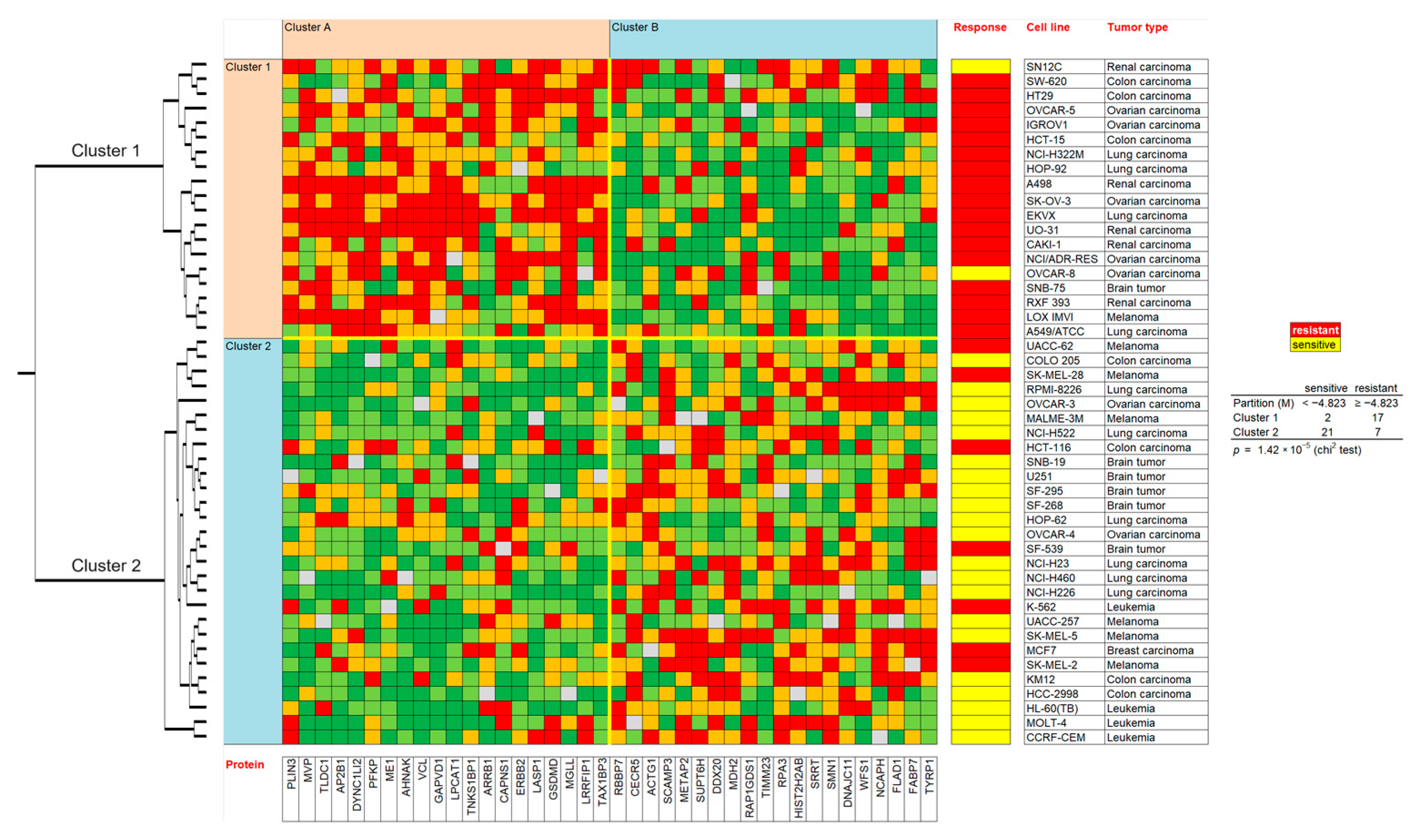 Then, the expression values of the NCI cell lines for the protein expressions were subjected to hierarchical cluster analysis to determine whether clusters of cell lines may possess predictive power regarding sensitivity or resistance of the cell lines to berberine chloride. The dendrogram of the cluster analysis indicated two main branches in the cluster tree that were represented in the heatmap (Figure 4).