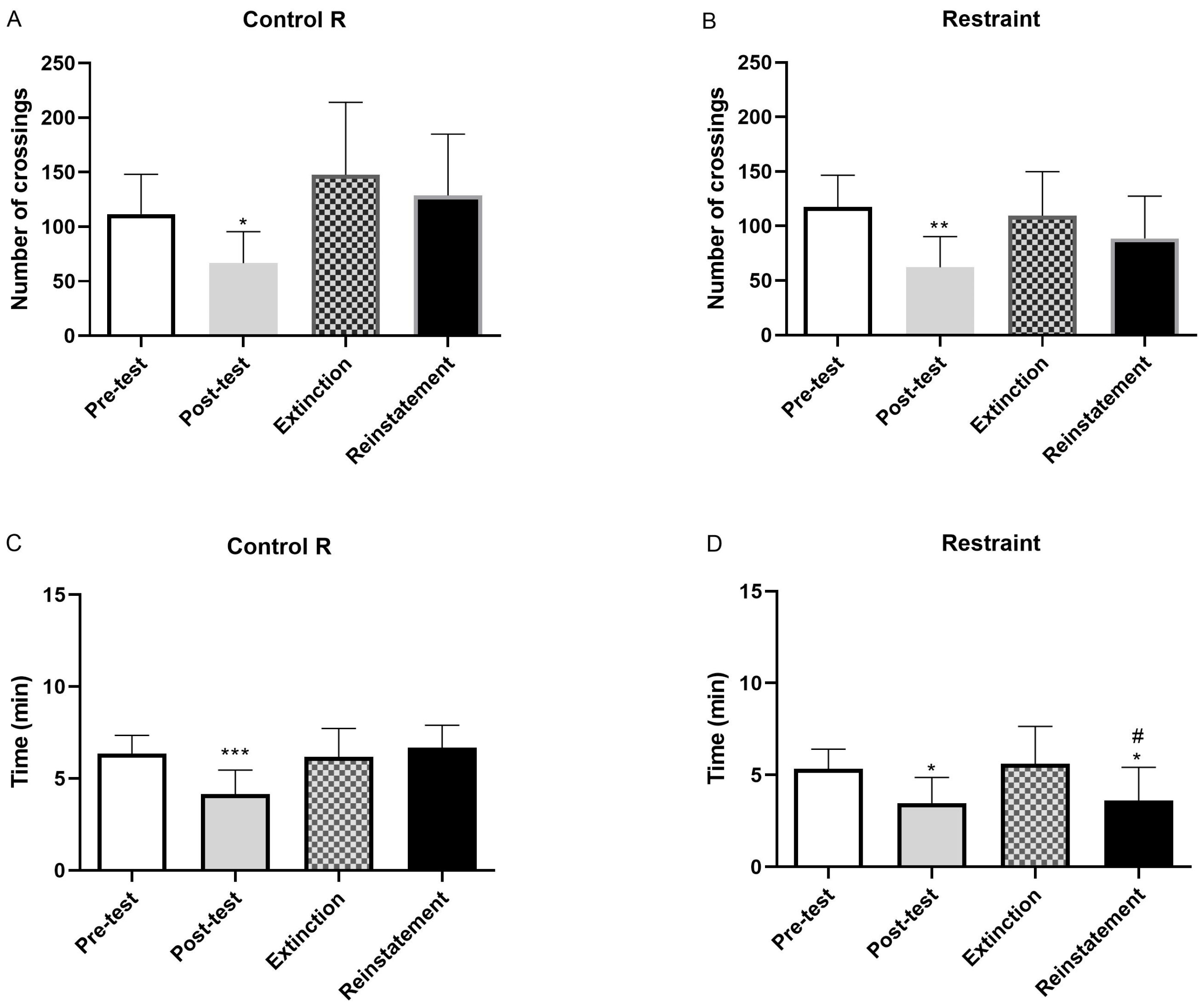 2.3. Number of Crossings and Time Spent by Chamber After Extinction of Naloxone-Induced CPA and Posterior Exposure to Stressful Stimuli
