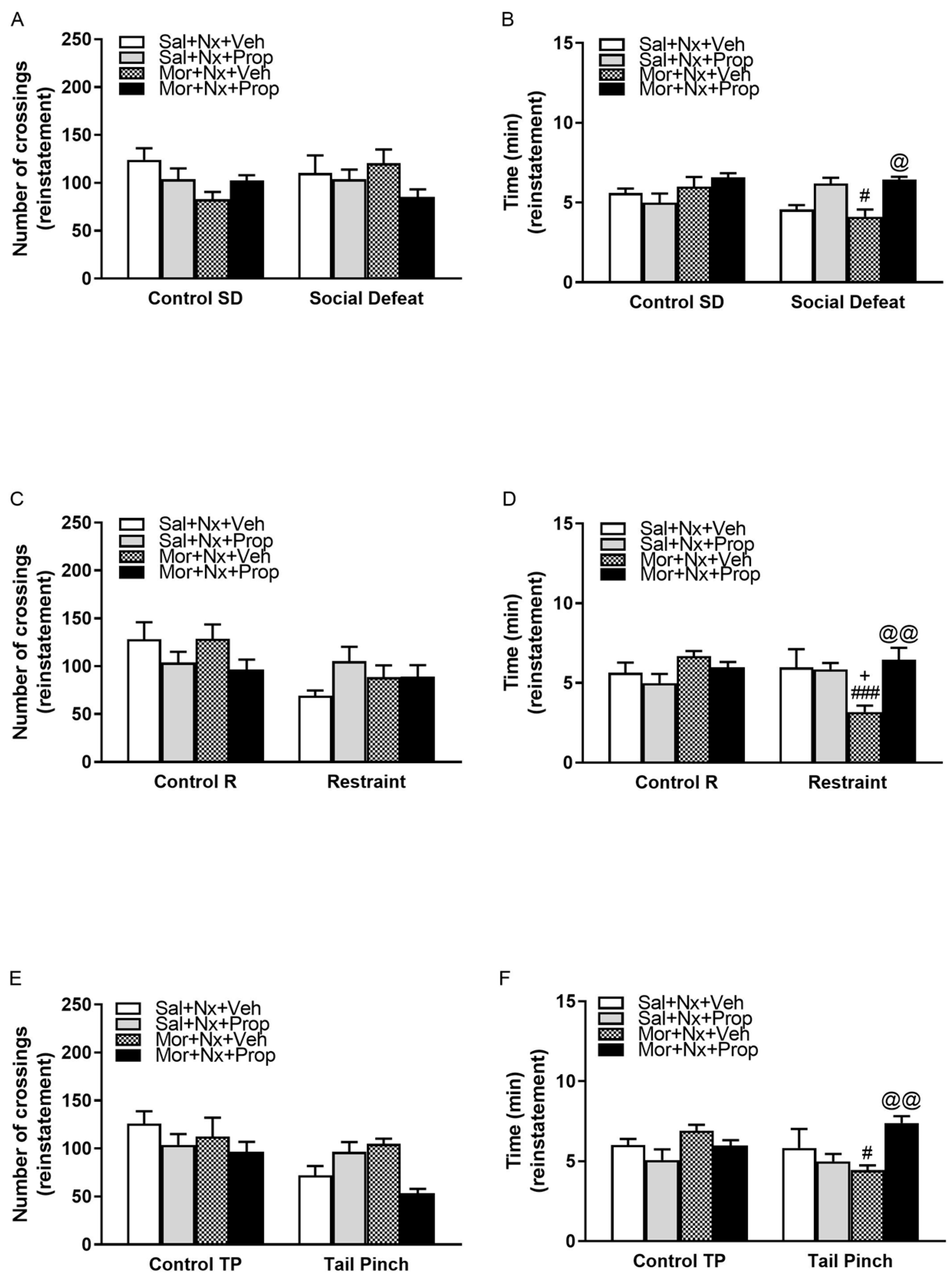 2.4. Influence of Propranolol (β-ARs Antagonist) on the Number of Crossings and Time Spent by Chamber After Extinction of Naloxone-Induced CPA and Posterior Exposure to Stressful Stimuli