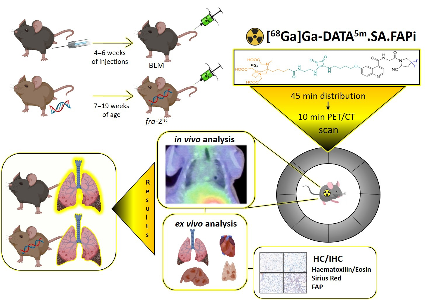 - Sun, R.; Huang, Y.; Deng, H.; Wang, Q.; Xiao, C.; Guo, C.; Wang, T.; Liu, L.; Hua, J.; Chen, X. 68Ga-FAPI PET/CT for Diagnostic Accuracy and Therapeutic Response Assessment in Bleomycin-Induced Pulmonary Fibrosis: An Integrated Preclinical Study. Front. Med. 2025, 12, 1613010. [Google Scholar] [CrossRef]
