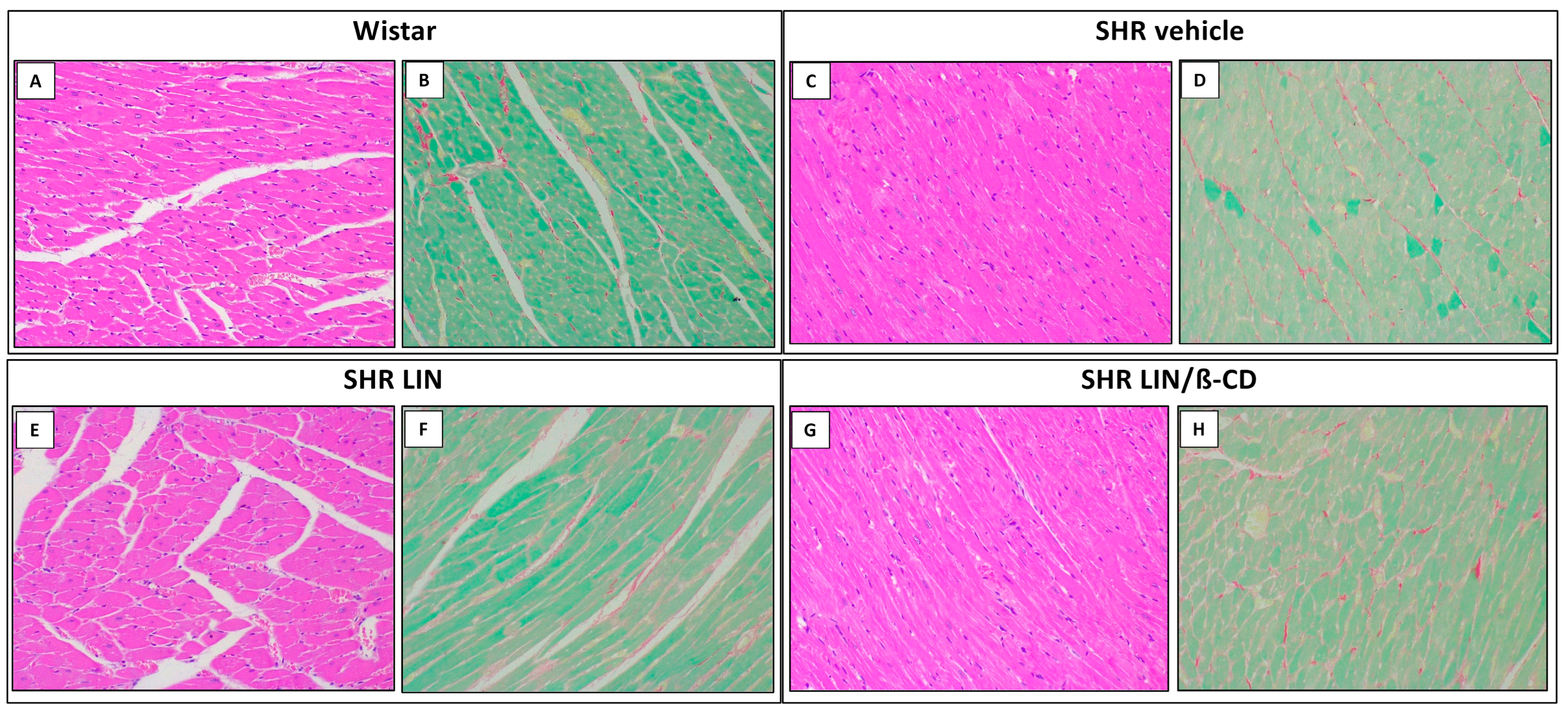 4.7. Effects of LIN and LIN/β-CD on Cardiac Mass Index and Histopathological Morphophysiology