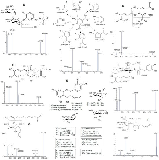| 21 | 7.701 | 295.04444 | 179.033, 135.044, 133.013, 115.002 | C13H12O8 [M-H]− | Caffeoyl malic acid |