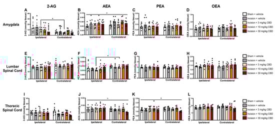N-acylethanolamines (PEA and OEA) or endocannabinoids (2-AG and AEA) in the plasma, spinal cord, or discrete brain regions related to nociception and pain processing. A significant increase in AEA levels was observed in the ipsilateral vs. contralateral amygdala and a decrease in 2-AG levels in the ipsilateral vs. contralateral lumbar spinal cord in the 3 mg/kg CBD group. This result suggests potential dose-specific, region-specific and side-specific effects of CBD on the endocannabinoid system. A limitation of the present study is that CBD levels in plasma and tissue were not assessed, which may limit the interpretation of the molecular analysis, but was outside the scope of the present study. CBD has activity at targets both internal and external to the endocannabinoid system, which has been extensively reviewed [