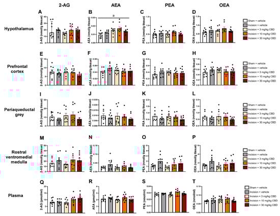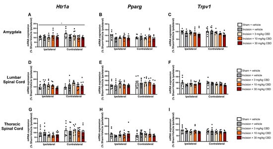 Non-time course parametric data were analysed using a one-way ANOVA with treatment (sham-vehicle, incision-vehicle, incision-3 mg/kg CBD, incision-10 mg/kg CBD, or incision-30 mg/kg CBD) as the between-subject factor. One-way ANOVA was performed because of the unbalanced study design. For lateralised regions, two-way ANOVA was performed with procedure/treatment (sham-vehicle, incision-vehicle, incision-3 mg/kg CBD, incision-10 mg/kg CBD, or incision-30 mg/kg CBD) and side (ipsilateral or contralateral) as the between-subject factors. Post hoc analysis was carried out following one- or two-way ANOVA using Tukey’s Honest Significant Difference test, where appropriate. The level of significance was set at p < 0.05.