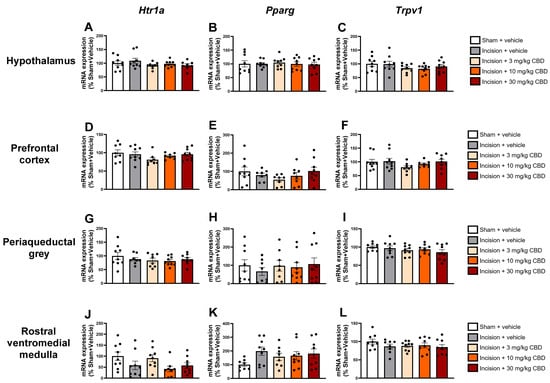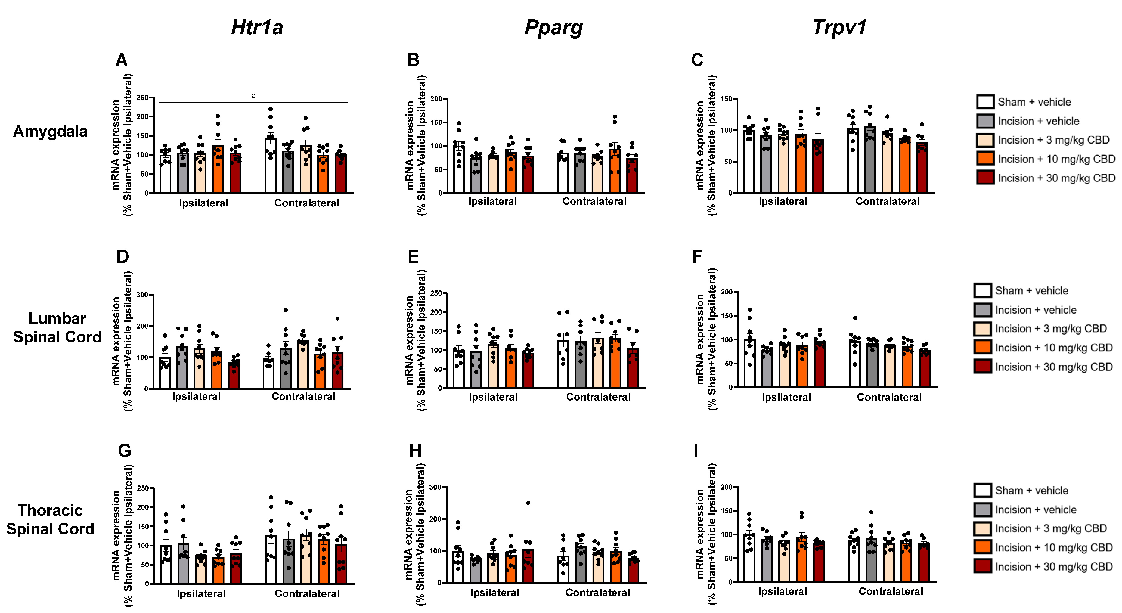 17]. It is possible that the time point in this study was too early to assess CBD-induced alterations in the mRNA expression of these targets. Other differences between these studies include the model (incisional pain vs. neuropathic pain), dosing regimen (single acute vs. daily for 3 days), and assessment method (RT-qPCR vs. immunohistochemistry), which may further account for the lack of alterations in the expression of these targets observed in the present study. CBD has a T