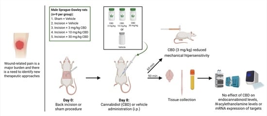 28]. While this study focused on the effects of CBD on the endocannabinoid system and the expression of genes encoding receptor targets in the CNS, a limitation of the current study is that peripheral or site-specific effects at the wound were not investigated. Future work should investigate the effects of systemic CBD on inflammatory markers at the site of the wound and assess the antinociceptive and anti-inflammatory effects of local CBD administration in this wound model.