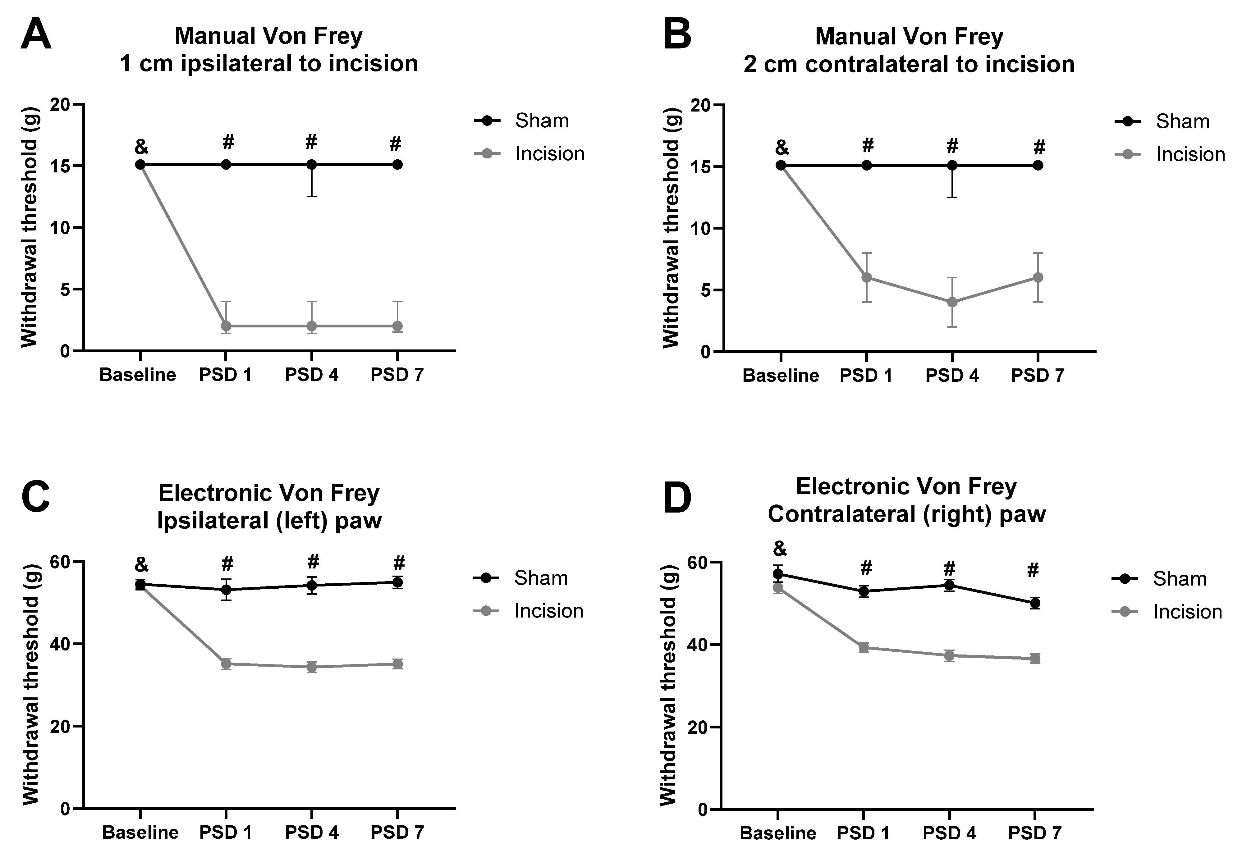 Pain-related behavioural testing was performed on both the dorsum (1 cm ipsilateral and 2 cm contralateral to the dorsum incision) and hind paws using manual and electronic von Frey testing, respectively. The light intensity at the arena level was set to 40 lx. Testing was completed at approximately the same time of the day in a quiet, temperature-controlled room.