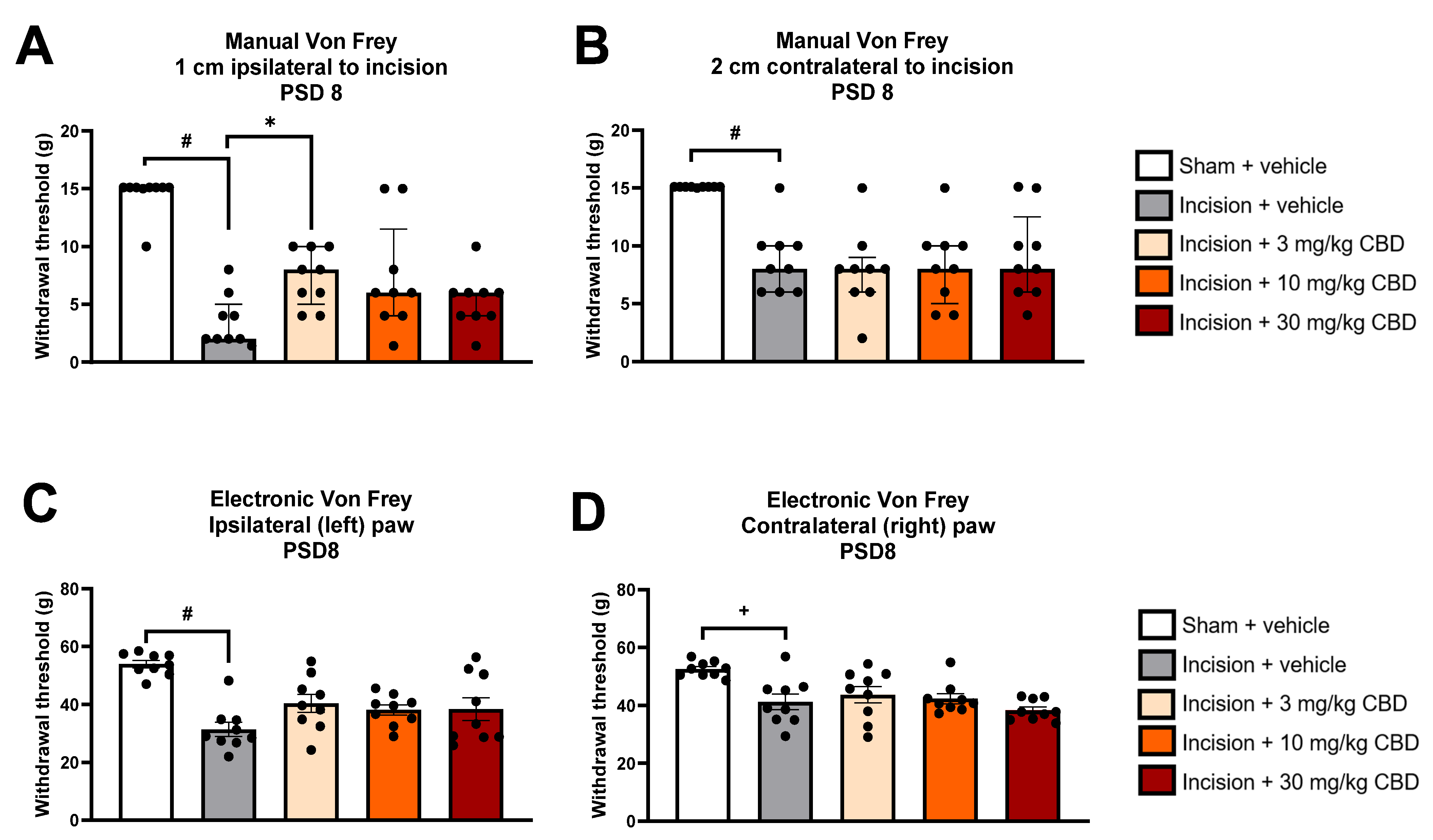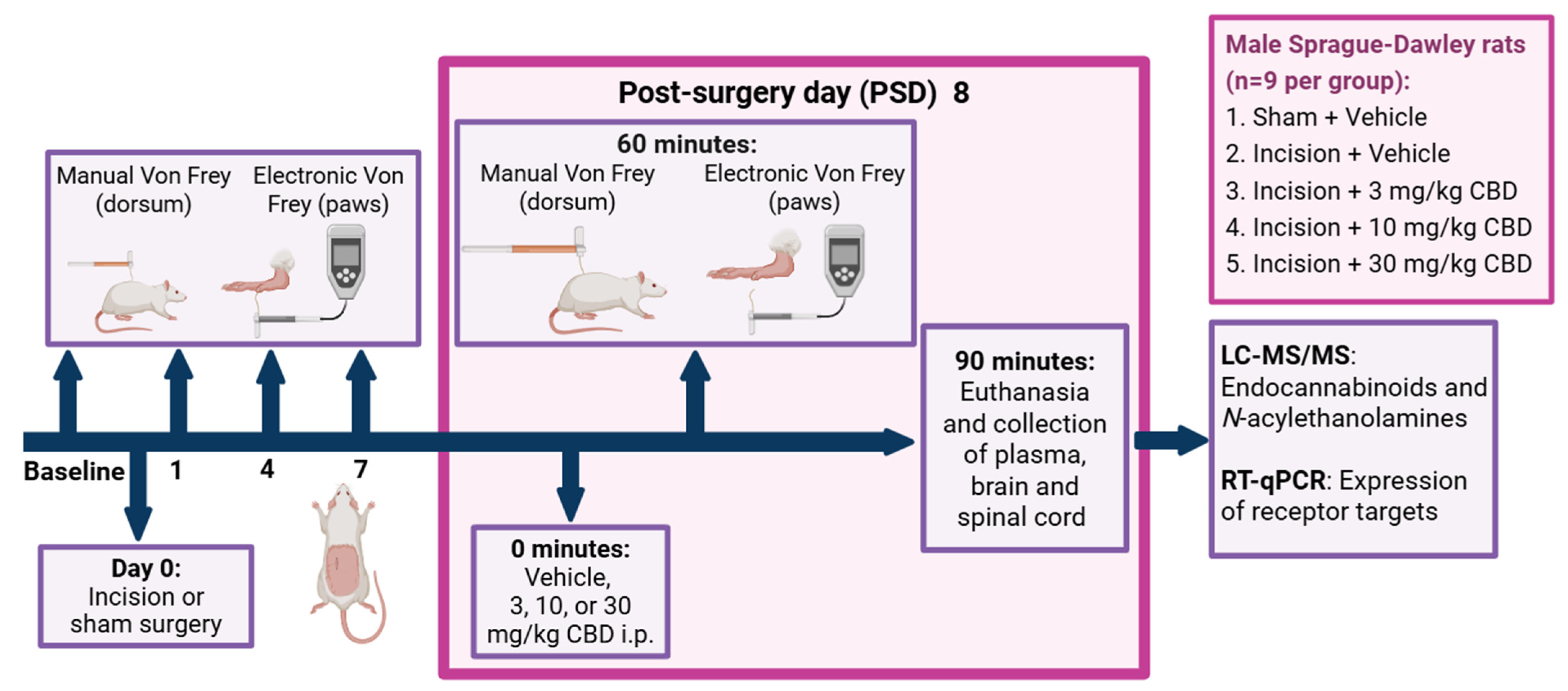 Manual and electronic von Frey tests were performed on the dorsum and hind paws, respectively, on PSDs 1, 4, and 7. Following behavioural testing on PSD 7, incision rats were further pseudo-randomly assigned to receive either vehicle or CBD (3, 10, or 30 mg/kg) to ensure no significant differences in weight or mechanical withdrawal thresholds between incision groups prior to drug administration. On PSD 8, rats received an i.p. injection of vehicle (Cremophor–ethanol–saline 1:1:18), 3 mg/kg CBD, 10 mg/kg CBD, or 30 mg/kg CBD in an injection volume of 2 mL/kg and were subjected to mechanical sensitivity testing 60 min post-drug administration. The researcher who performed the behavioural testing was female and blinded to the drug treatment. Rats were euthanised by live decapitation 90 min after drug administration and 30 min after the commencement of pain-related behavioural testing. The experimental unit was one rat.