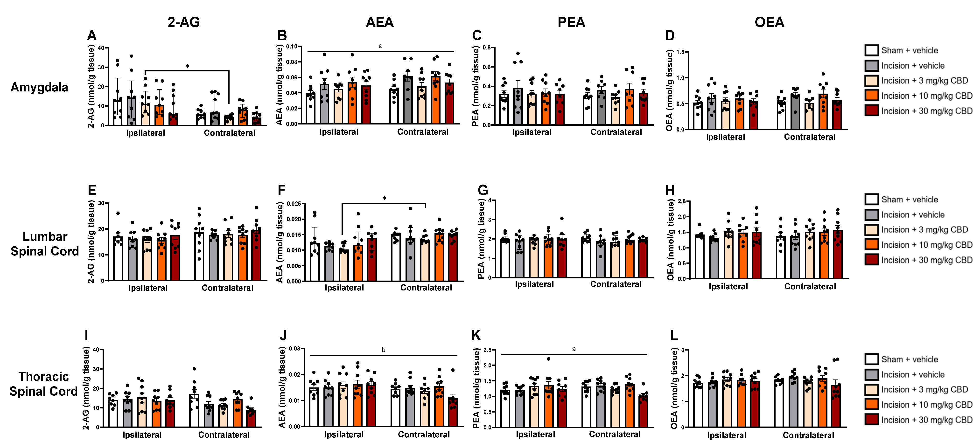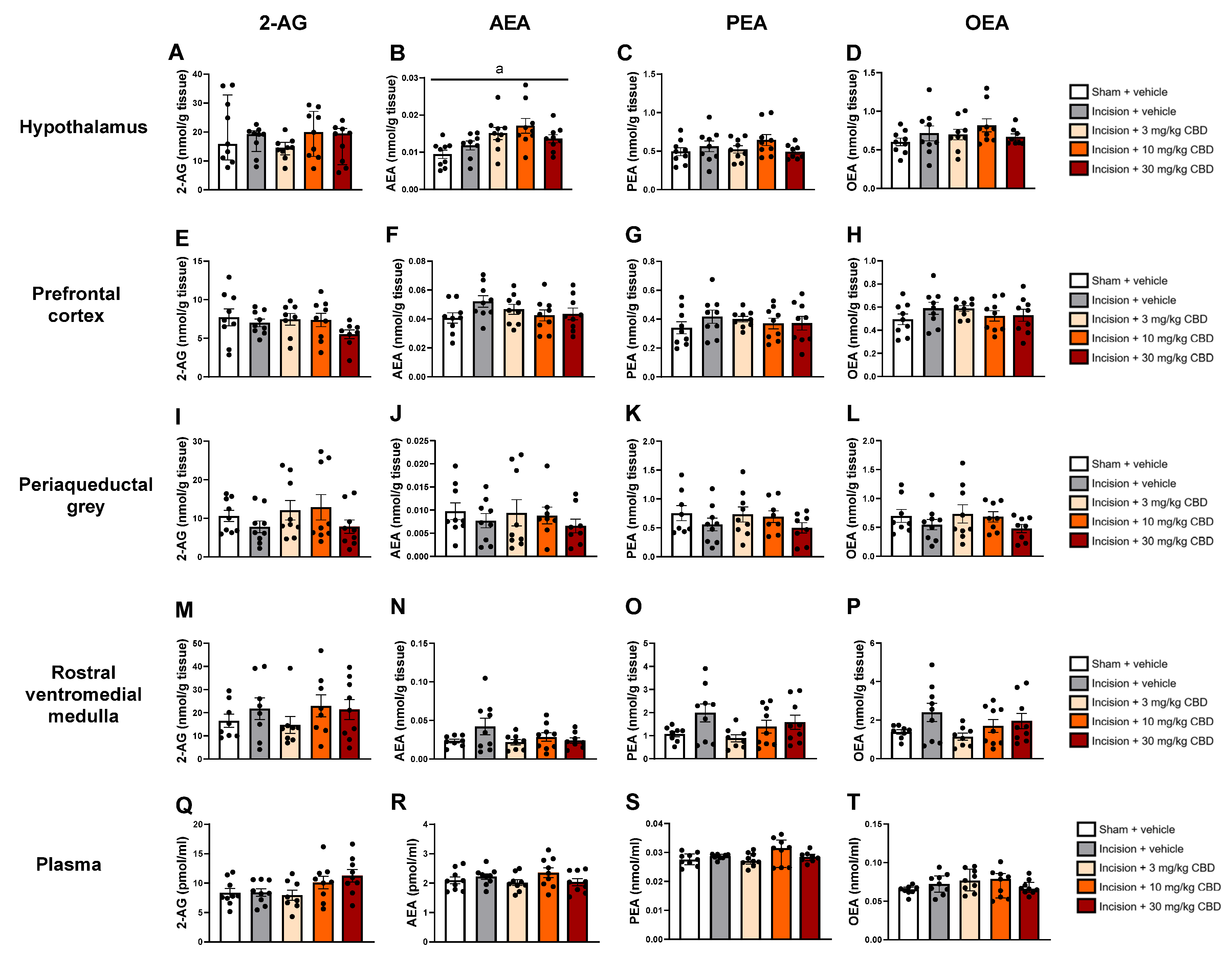 The aims of the present study were to investigate the effects of acute, systemic administration of CBD on nociceptive behaviour following dorsum incision in male Sprague Dawley rats, and investigate the effect of CBD on the levels of endocannabinoids (2-arachydonyl glycerol [2-AG] and anandamide [AEA]) and related N-acylethanolamines (N-palmitoylethanolamide [PEA] and N-oleoylethanolamide [OEA]), in the plasma, spinal cord, and key brain regions related to nociception. It also aimed to investigate the effect of CBD on the expression of select receptor targets of CBD in the spinal cord and discrete brain regions related to nociception.