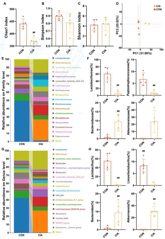 Dysregulated metabolism of gut microbiota in CIA rats. (A) Chao1 index (n = 5). (B) Simpson index (n = 5). (C) Shannon index (n = 5). (D) β-diversity of the gut microbiota based on PCA analysis (n = 5). (E) Percent taxa at the family level (n = 6). (F) Relative abundance of taxa at the family level (n = 5). (G) Percent taxa at the genus level (n = 6). (H) Relative abundance of taxa at the genus level (n = 5). Data are presented in mean ± SD. ## p < 0.01, compared with CON.