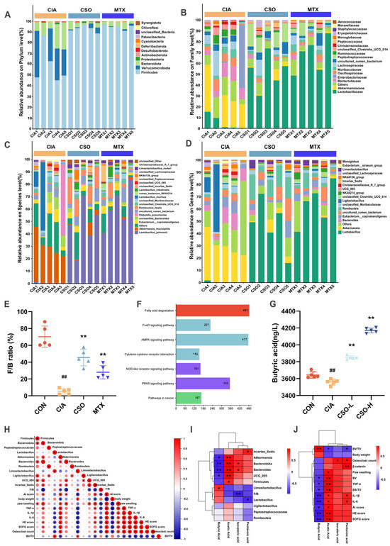 CSO modulation of gut microbiota-butyric acid. (A) Abundance analysis at the phylum level. (B) Abundance analysis at the family level. (C) Abundance analysis at the species level. (D) Abundance analysis at the genus level. (E) F/B ratio. (F) Predictive analysis of KEGG pathways. (G) Serum levels of butyric acid in mice. (H) Correlation analysis between gut microbiota, joint inflammation, and bone destruction. (I) Correlation analysis between SCFAs and gut microbiota. (J) Correlation analysis between SCFAs and inflammatory factors. Data are presented as mean ± SD. ## p < 0.01, compared with CON; * p < 0.05, ** p < 0.01, compared with CIA; n = 5. When the correlation coefficient exceeds zero (r > 0), it reflects a positive association; conversely, a value less than zero (r < 0) indicates a negative association.