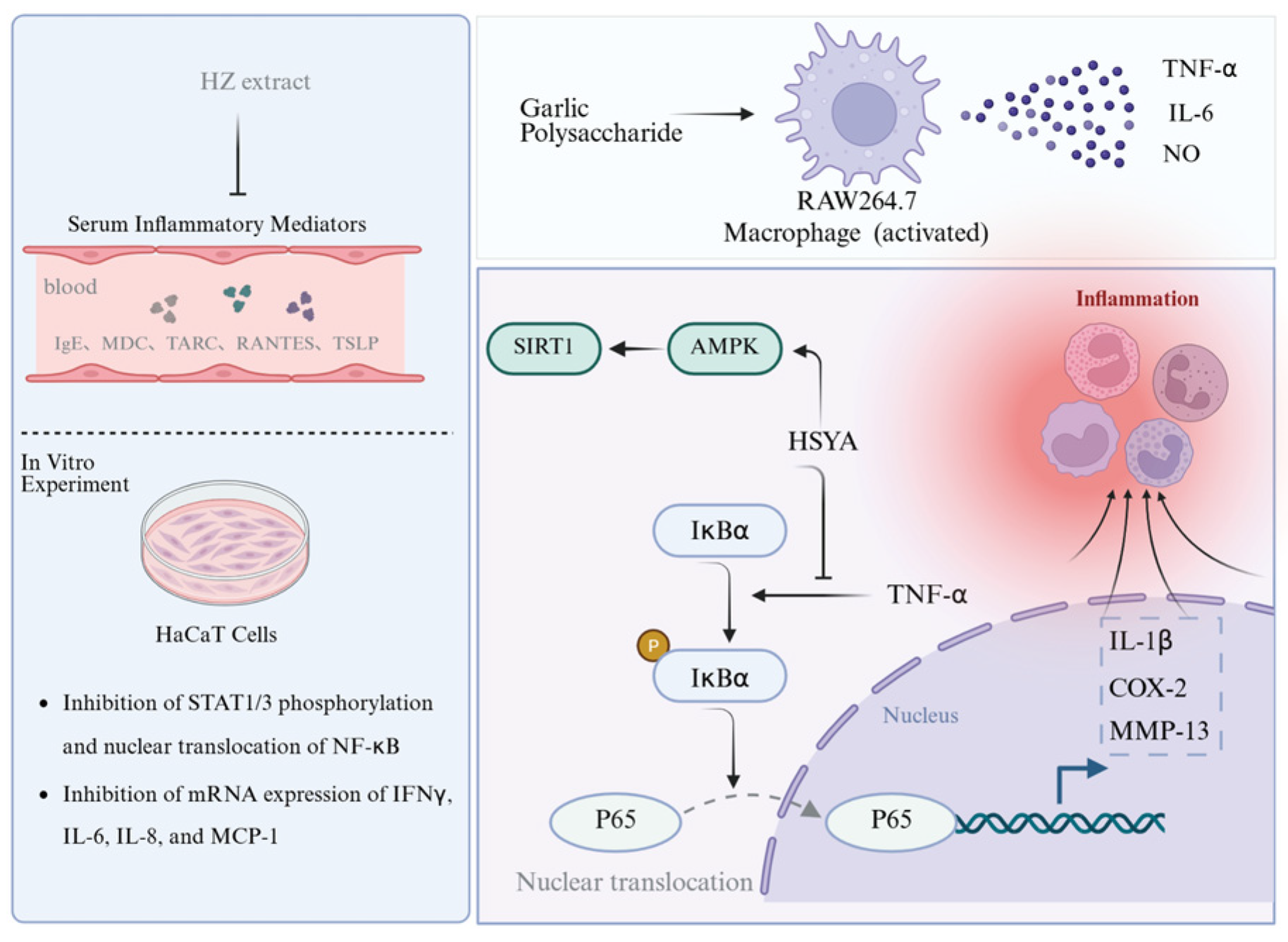 | Aqueous extract | Anti-inflammatory | Mouse atopic dermatitis model | IgE ↓, MDC ↓, TARC ↓, RANTES ↓, TSLP ↓, STAT1/3 ↓, NF-κB ↓ | 100 mg/kg | [148] | |