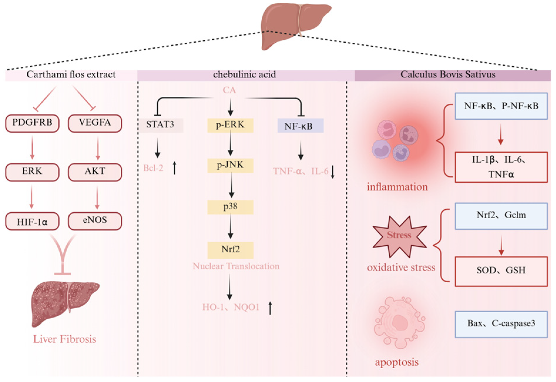 | Aqueous extract | Hepatoprotective | CCl4-induced liver fibrosis model | ALT ↓, AST ↓, ALP ↓, γ-GT ↓, α-SMA ↓, HYP ↓, Col-IV ↓, PDGFRB ↓, p-MEK ↓, p-ERK1/2 ↓, HIF-1α ↓, VEGFA ↓, CD31 ↓, CD34 ↓, vWF ↓ | 1, 2, 4 g/kg | [170] | |