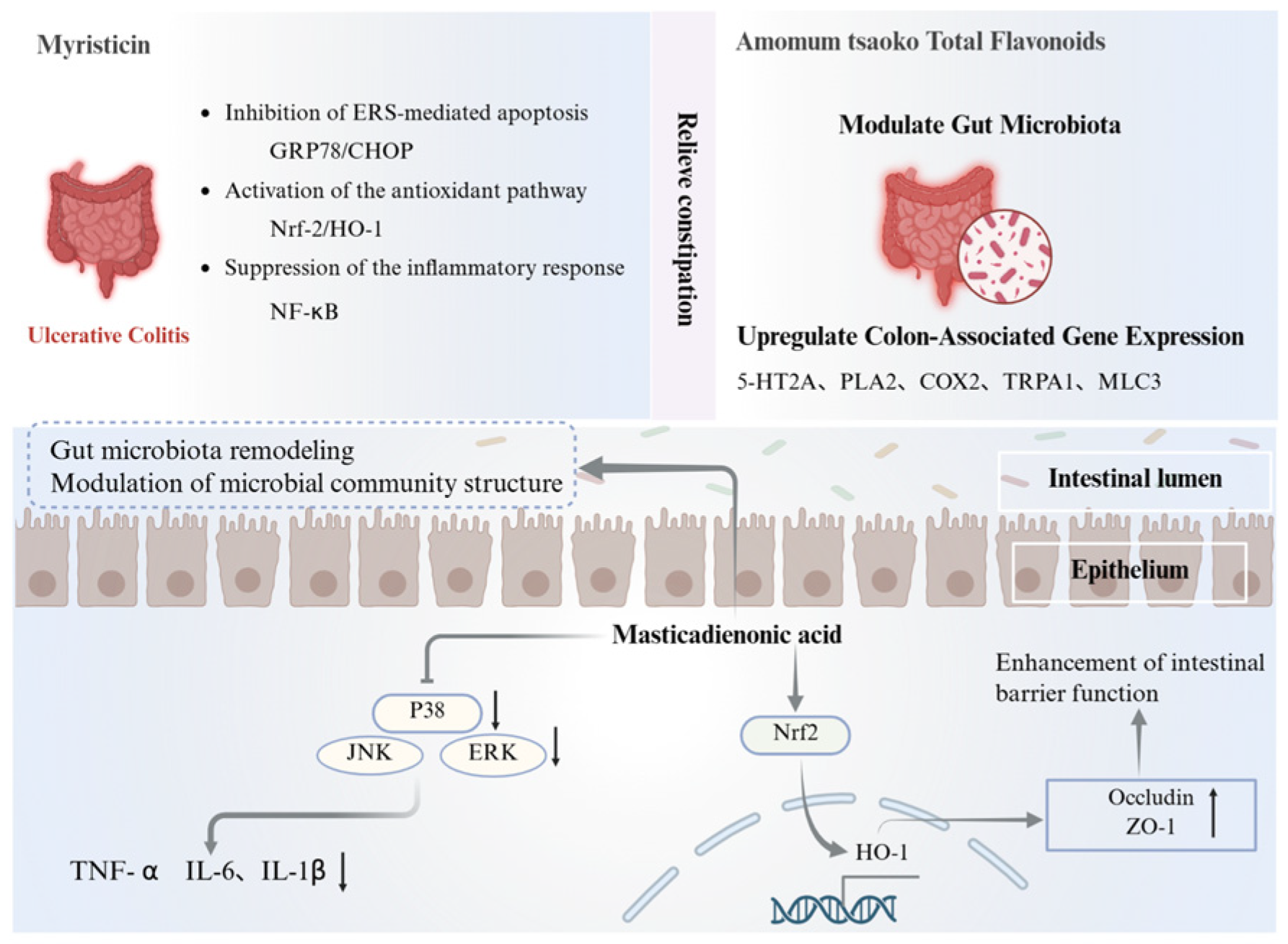 | masticadienonic acid | Gastrointestinal regulation | Acute colitis mouse model | TNFα ↓, IL-1β ↓, IL-6 ↓, ZO-1 ↑, occludin ↑ | 10 mg/kg, 100 mg/kg | [178] | |