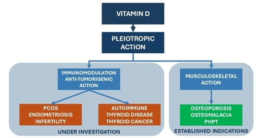 | Endometriosis | High prevalence of deficiency (70–85%) | Not Supported. | May reduce pelvic pain and inflammation | The evidence is insufficient and contradictory. The SAGE trial found no improvement in pelvic pain in vitamin D-sufficient patients |