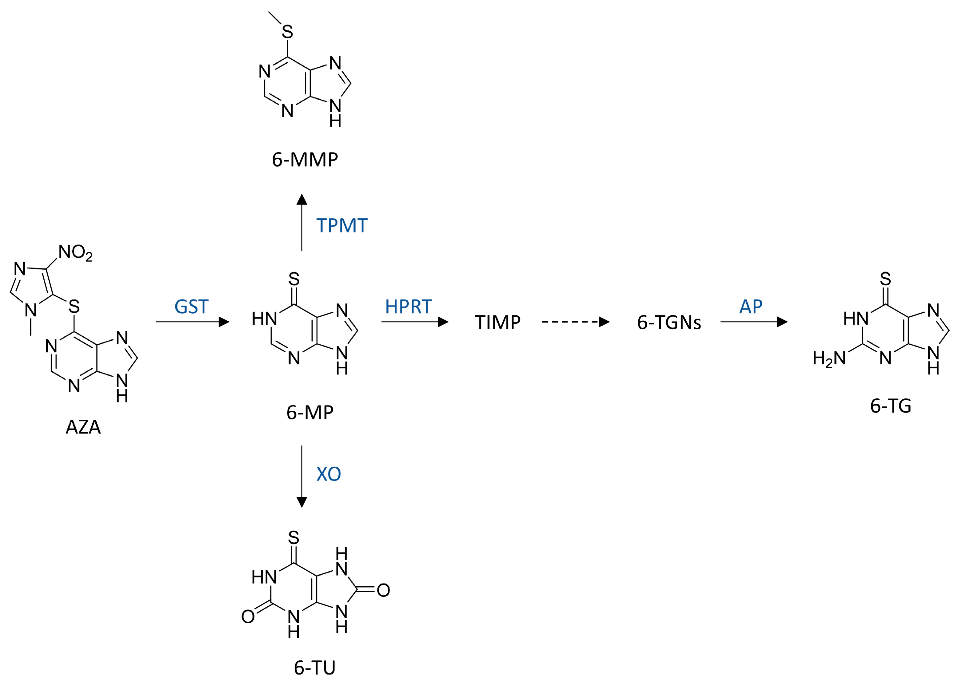 - Stocco, G.; Pelin, M.; Franca, R.; De Iudicibus, S.; Cuzzoni, E.; Favretto, D.; Martelossi, S.; Ventura, A.; Decorti, G. Pharmacogenetics of azathioprine in inflammatory bowel disease: A role for glutathione-S-transferase? World J. Gastroenterol. 2014, 20, 3534–3541. [Google Scholar] [CrossRef]