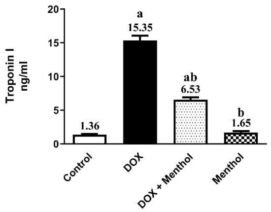 Effect of menthol on serum Troponin-1 (A) level. Data were expressed as mean ± S.E.M (n = 10). Menthol was given at a dose (100 mg/kg/p.o./daily) for 7 days. Blood and tissue samples were collected on day 8. Cardiotoxicity was induced by DOX (15 mg/kg, IP, once). Statistical analysis was performed using ANOVA followed by Turkey’s multiple comparison test. (n = 10) a: substantially varied from the control group, b: substantially varied from DOX group at p < 0.05.