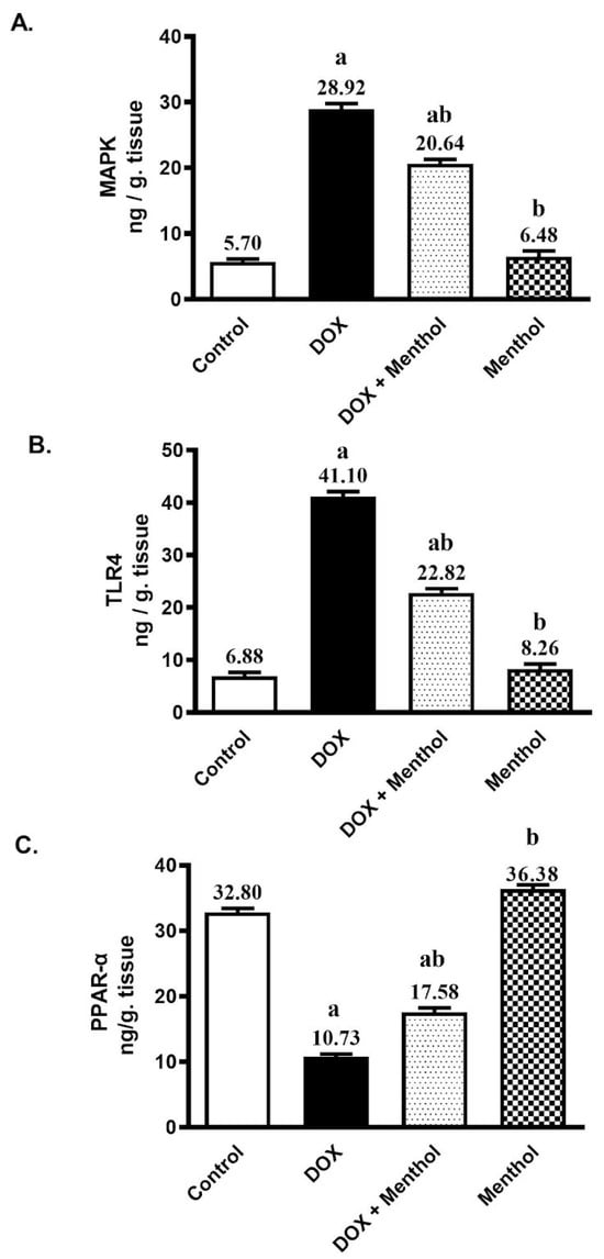 Effect of menthol on MAPK (A), TLR4 (B), and PPAR-α (C) contents. Data were expressed as mean ± S.E.M (n = 10). Menthol was given at a dose (100 mg/kg/p.o./daily) for 7 days. Blood and tissue samples were collected on day 8. Statistical analysis was performed using ANOVA followed by Turkey’s multiple comparison test. a: substantially varied from the control group, b: substantially varied from DOX group at p < 0.05.