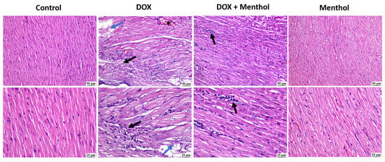 The photomicrographs show the cardiac tissue from various groups of experiments. The control group shows normal myocardium. In contrast, the DOC group reveals myocardial necrosis with fragmentation (blue arrows), infiltration of mononuclear cells (black arrow) at both magnifications, and congested blood vessels (*). The DOX + menthol group showed small focal aggregations of mononuclear inflammatory cells (arrows) at both magnifications and apparently normal myocardium. The menthol-alone group exhibits clearly normal myocardium. (H&E, ×400).