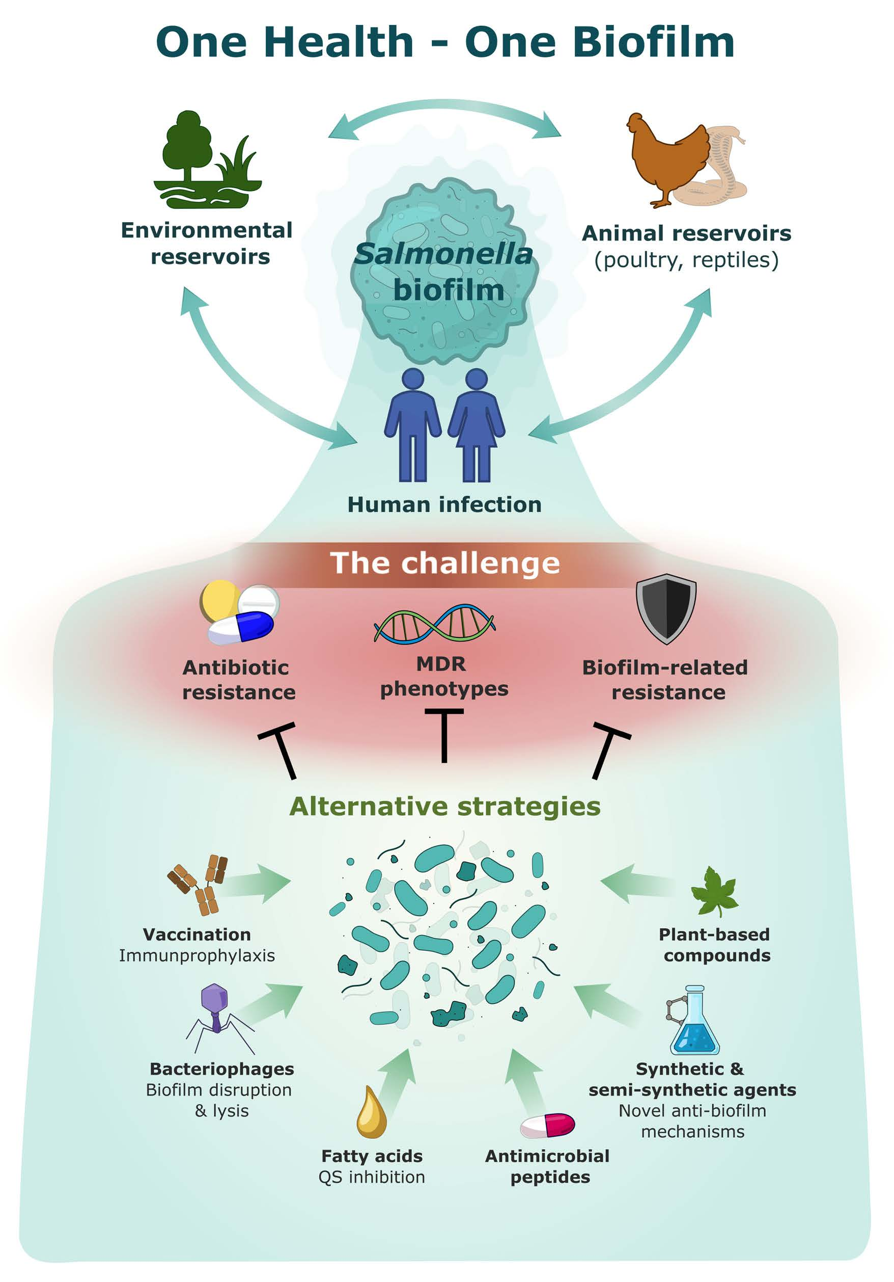 Salmonellosis as a One Health–One Biofilm Challenge: Biofilm Formation by Salmonella and Alternative Eradication Strategies in the Post-Antibiotic Era