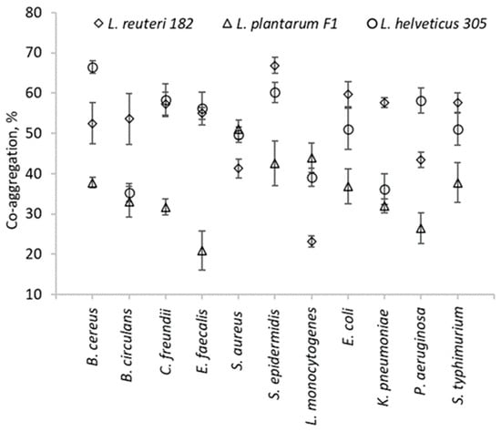 The highest co-aggregation of L. reuteri 182 occurred with S. epidermidis and reached 66.9 ± 2%. Meanwhile, the highest co-aggregation, provided by L. helveticus 305, was with B. cereus (66.5 ± 1.5%). L. plantarum F1 exhibited the lowest levels of co-aggregation with almost all tested strains.