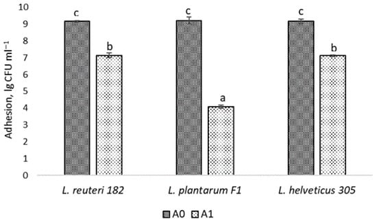 where A0—LAB cells, initially added to each well, CFU mL−1; A1—number of adherent LAB cells, CFU mL−1.