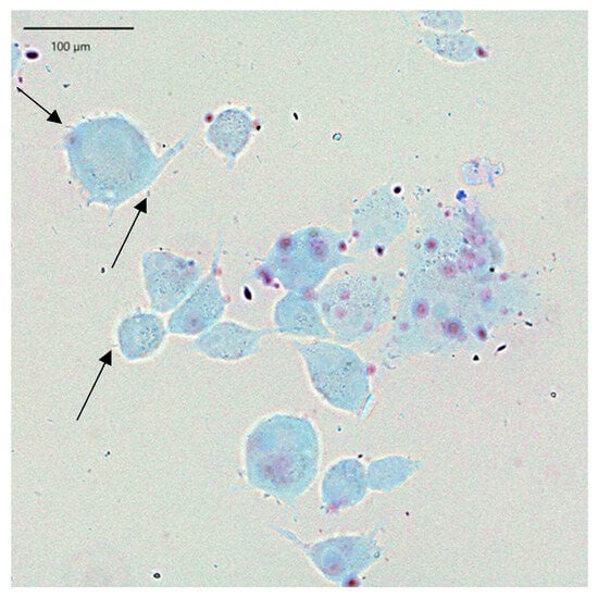 LAB adhesion was also assessed by Giemsa staining and following light microscopy, which confirmed the results obtained. In the presented Figure 4, keratinocyte cells and rod-shaped L. helveticus 305 bacteria abundantly surrounding them are clearly visible. On the contrary, L. plantarum F1, which exhibited a significantly lower capacity of adherence than L. helveticus 305, had a considerably lower number of bacteria attached to keratinocytes (Figure 5). It is worth emphasizing that the bacterial cell size of L. plantarum F1 is much smaller than that of L. helveticus 305, which complicated the image analysis and made it difficult to determine the number of adherent bacteria. Regarding the LAB behavior in the adhesion to keratinocyte cells, different types of biological processes and physical-chemical interactions are involved. Bacterial adhesion to human cells could be driven by hydrophobic interactions, the presence of surface binding proteins, such as fibronectin-binding proteins and surface layer proteins [7]. What is more, fimbriae or pili, which some Lactobacillus species can produce, may promote adhesion [19]. It is important to note that while these mechanisms are supported by literature, direct mechanistic confirmation in the context of this study would require advanced analyses such as omics approaches, surface characterization, or gene expression profiling. These techniques were beyond the scope of the present work and further in-depth investigations into the molecular basis of LAB adhesion on human skin are needed.