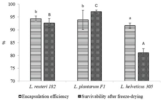 LAB encapsulation efficiency and survivability after freeze-drying. Results marked with different lowercase letters are statistically significantly (p < 0.05) different when comparing encapsulation efficiency; results marked with different uppercase letters are statistically significantly (p < 0.05) different when comparing survivability.