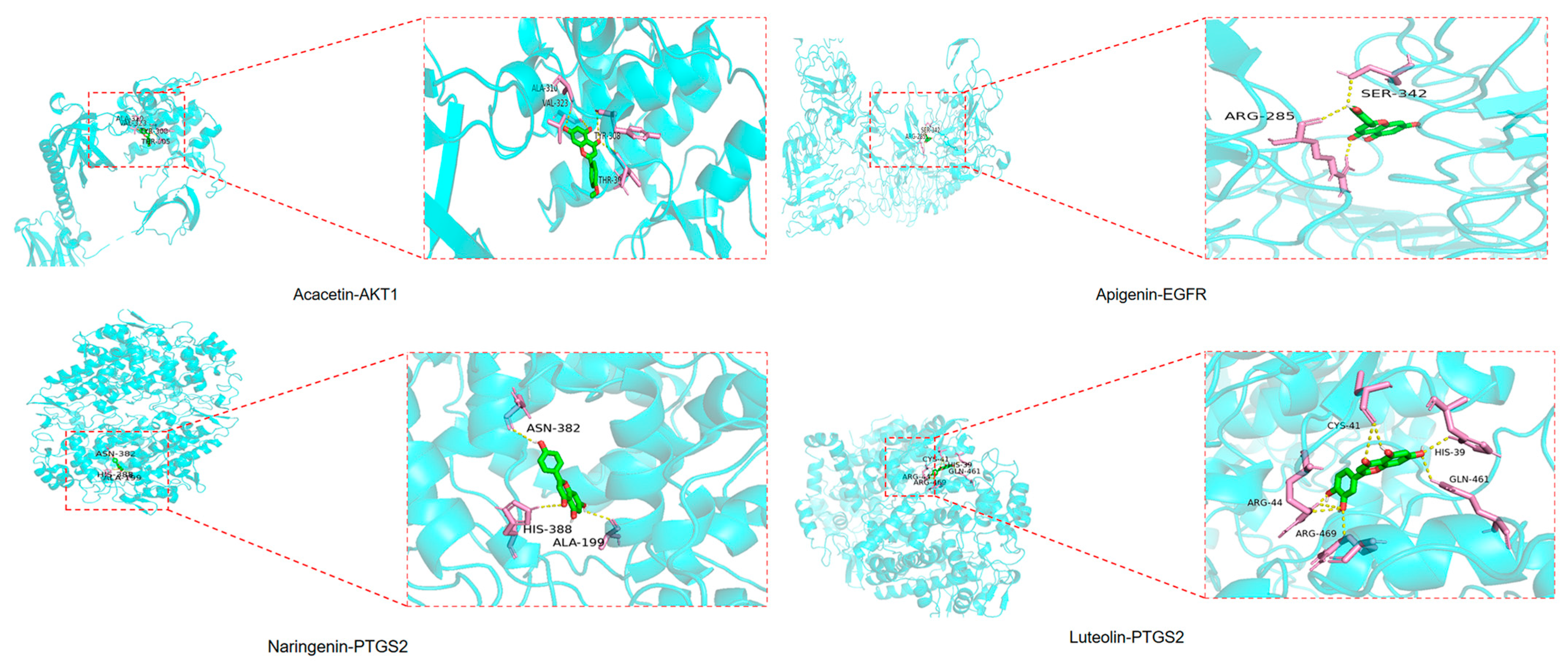 | Acacetin | PTGS2 | −9.30 | Luteolin | PTGS2 | −9.50 |