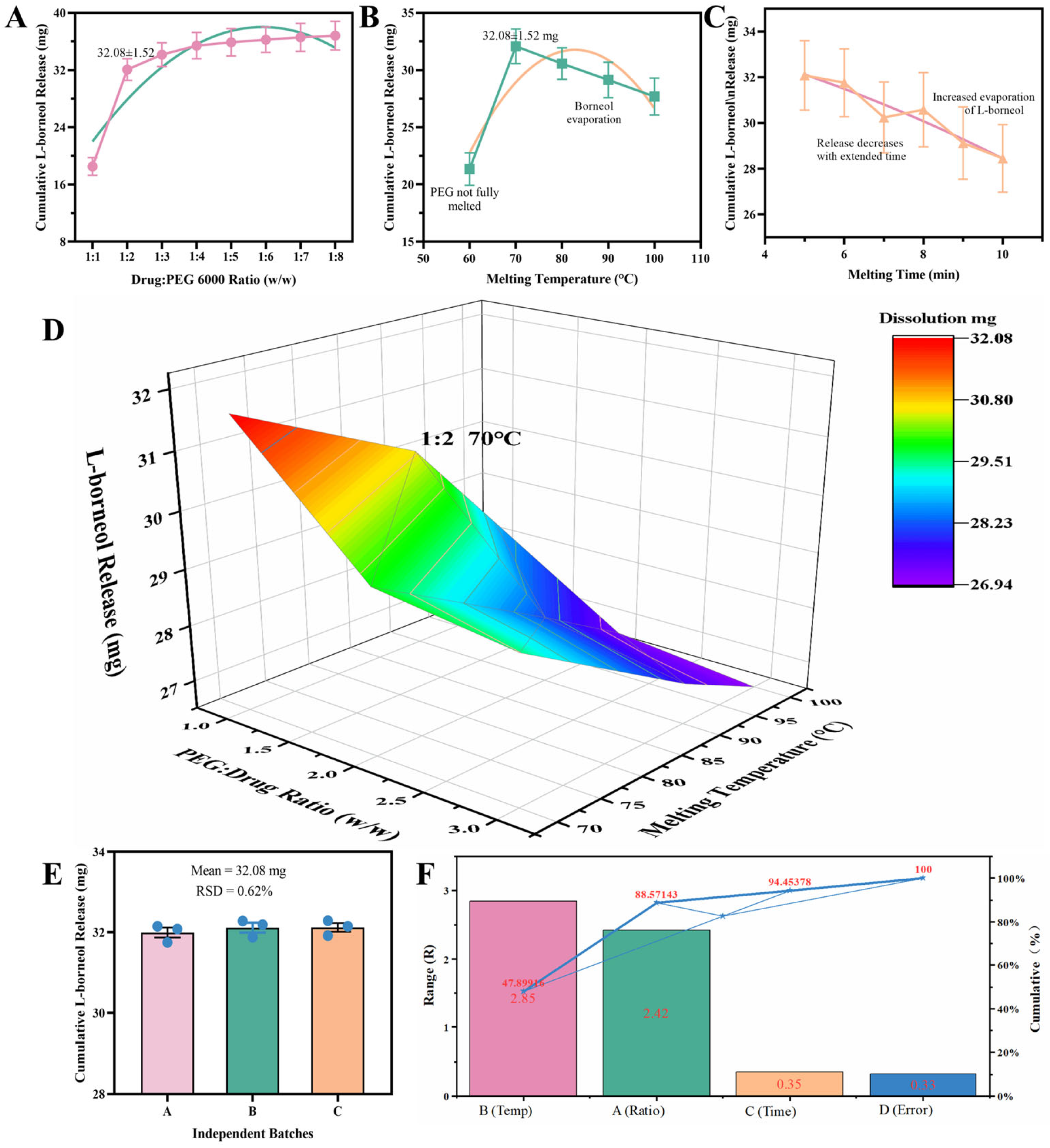 To identify key formulation parameters affecting the dissolution behavior of the solid dispersions, the effects of drug-to-carrier ratio, melting temperature, and melting time on the cumulative release of L-borneol were examined.