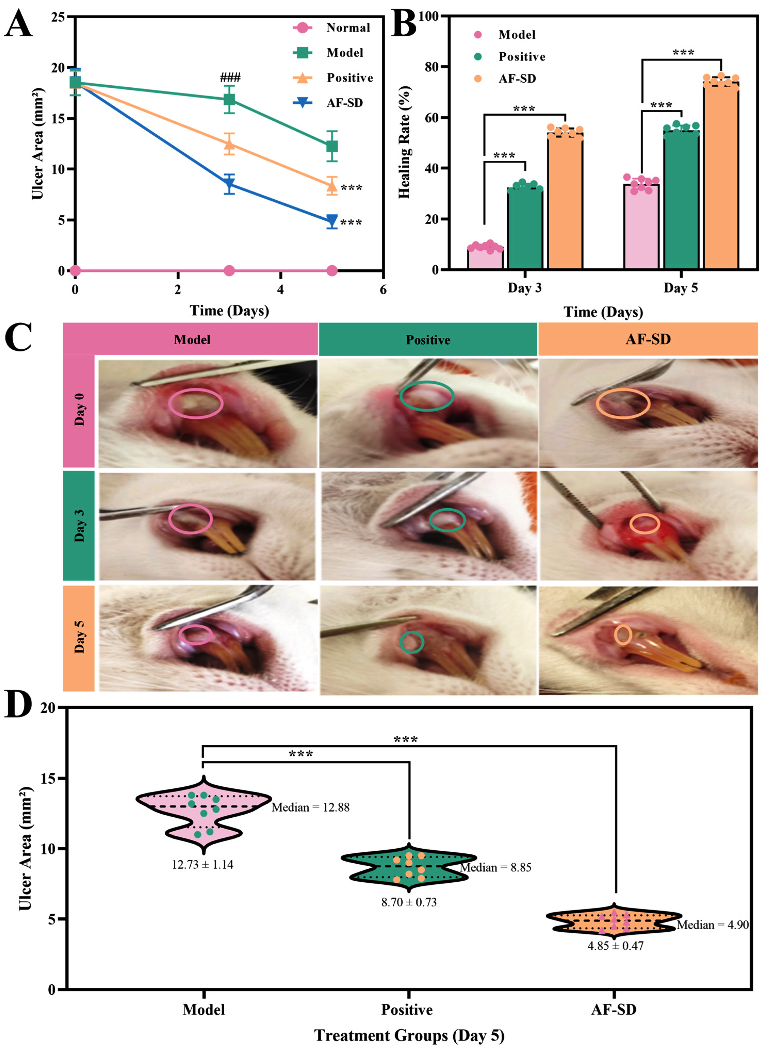 However, several limitations of this study should be acknowledged. First, the chemical cauterization model employed mainly mimics acute mucosal injury and does not fully capture the complex autoimmune etiology responsible for the recurrence of ROU. Second, detailed pharmacokinetic data, specifically regarding mucosal residence time and local tissue distribution, are currently lacking. Although serum cytokines confirmed systemic absorption, the local drug concentration at the ulcer site remains to be quantified. Therefore, future research directions will focus on: (1) utilizing immune-mediated relapse models to evaluate long-term efficacy; (2) performing LC-MS/MS-based PK profiling to optimize the dosing regimen; and (3) developing advanced dosage forms, such as mucoadhesive patches or buccal films incorporating AF-SD, to further prolong mucosal contact time and improve patient compliance. With these advancements, AF-SD has the potential to evolve into a safe, effective, and affordable therapeutic option for ROU.