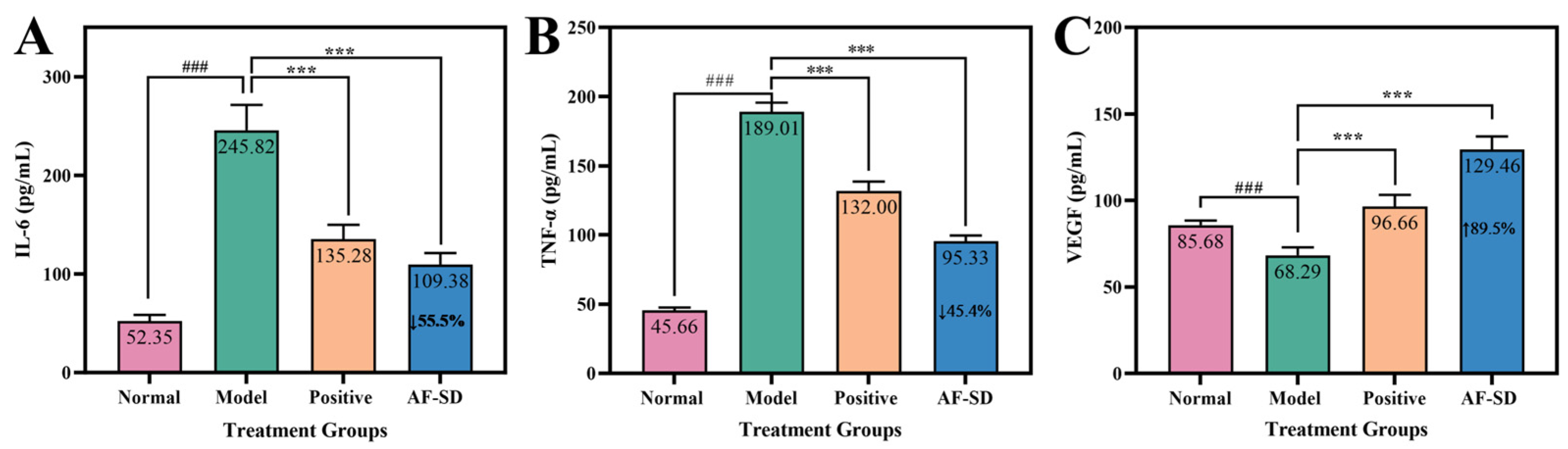 This study revealed a dual pharmacological mechanism by which AF-SD treats ROU: (i) suppression of pro-inflammatory cytokines and (ii) promotion of angiogenesis and tissue repair via VEGF upregulation. This combined “anti-inflammatory plus pro-repair” strategy offers a new therapeutic paradigm for ROU.