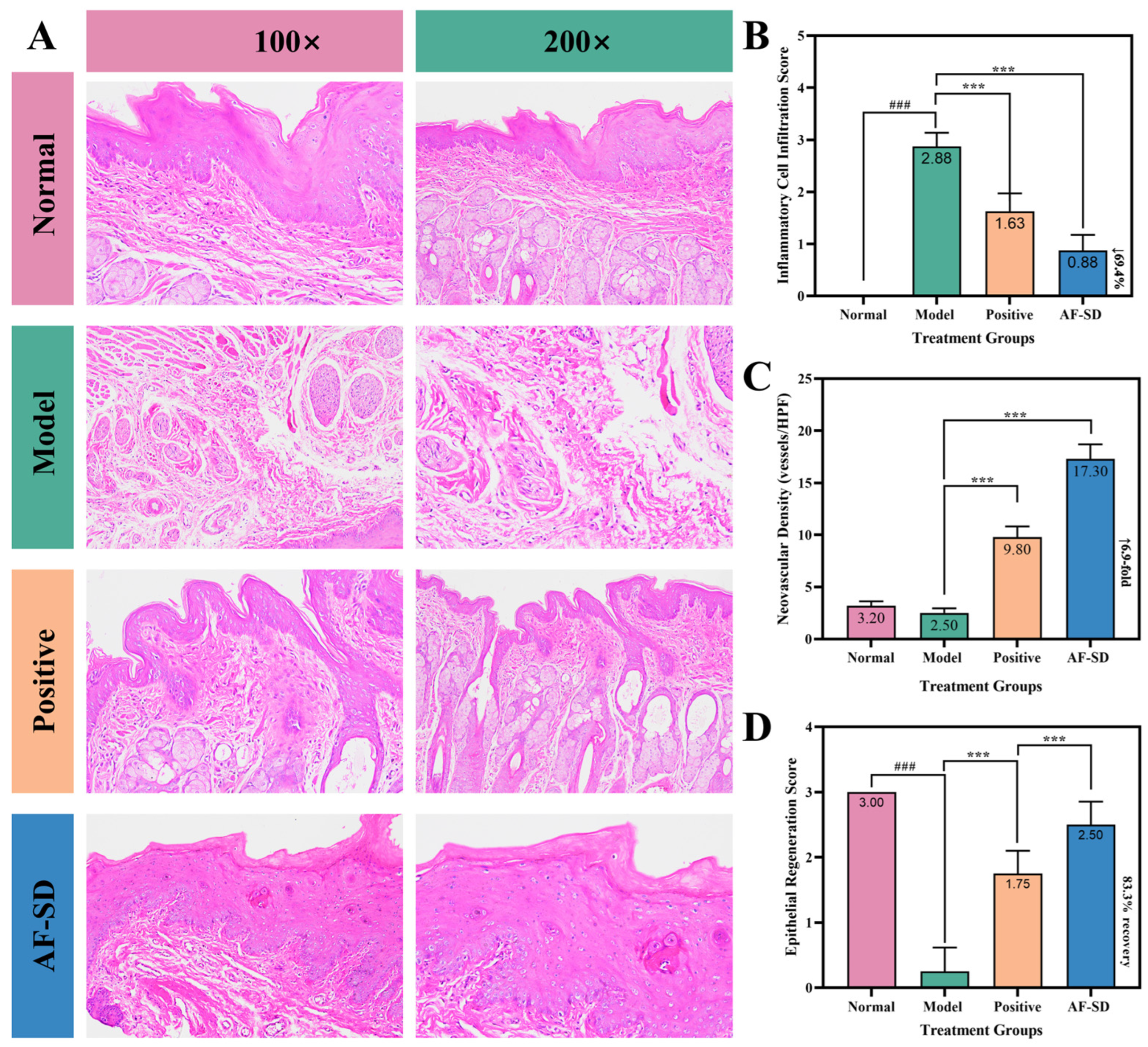 58]. Jinhoujian Spray, although composed of multiple herbal components, primarily provides anti-inflammatory “heat-clearing and detoxifying” effects, with relatively weaker pro-angiogenic activity. By concurrently rebalancing inflammation and repair, AF-SD not only rapidly controls inflammation but also actively promotes tissue regeneration. This may underlie its superior efficacy compared with the positive control and suggests that, for ROU, an “anti-inflammatory only” strategy may be insufficient, whereas combined “anti-inflammatory plus pro-repair” approaches are better aligned with the physiology of wound healing.