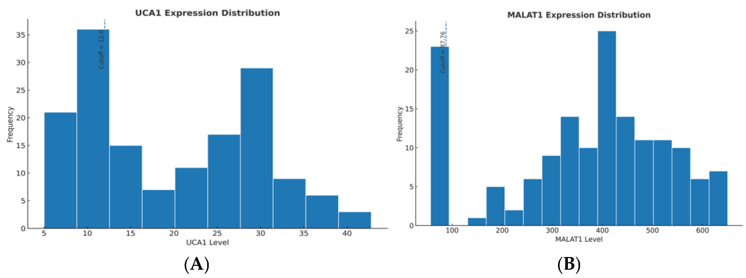The prognostic cut-off values (UCA1 >12.0 and MALAT1 >87.76, expressed as relative expression units calculated using the 2