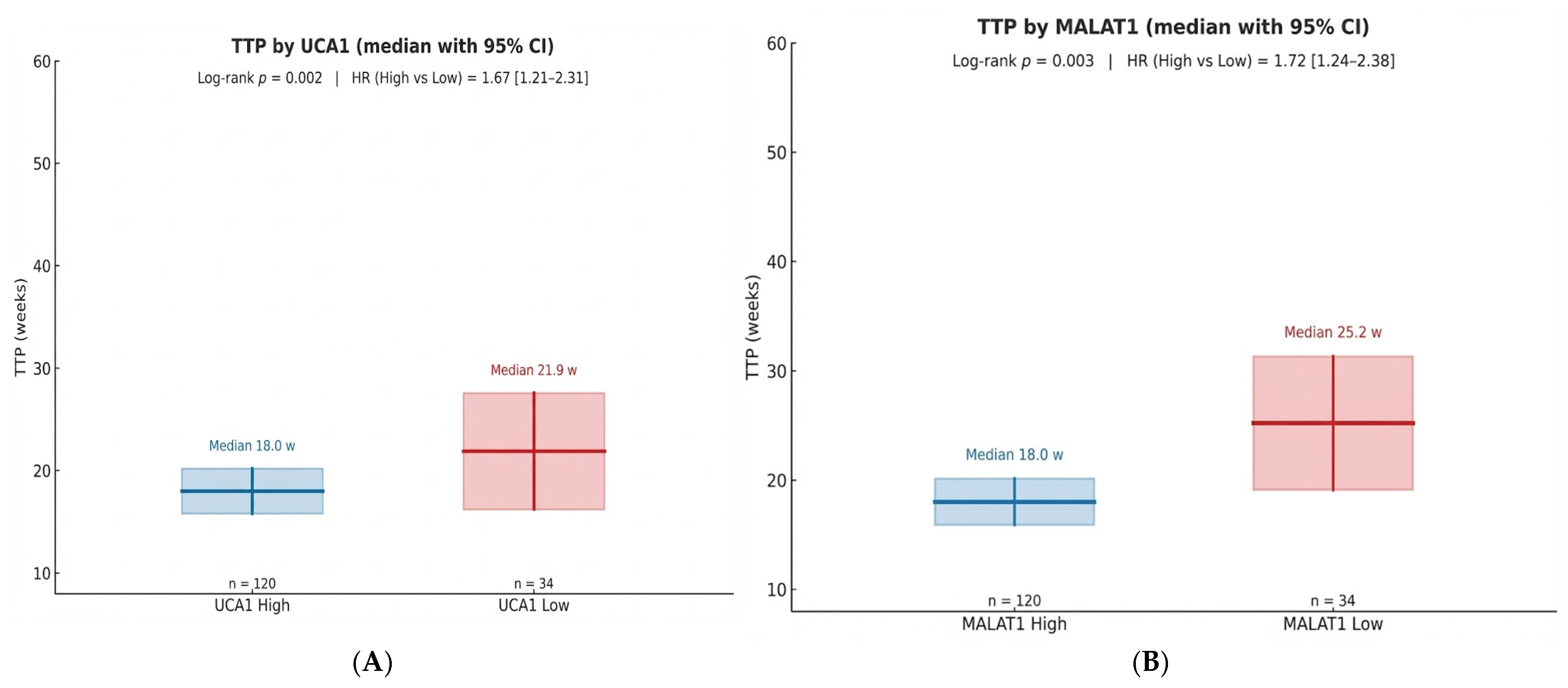 Patients were stratified independently for each biomarker. Consequently, the ‘Low’ and ‘High’ expression groups for UCA1 and MALAT1 are not mutually exclusive, allowing for the analysis of each lncRNA’s unique contribution.