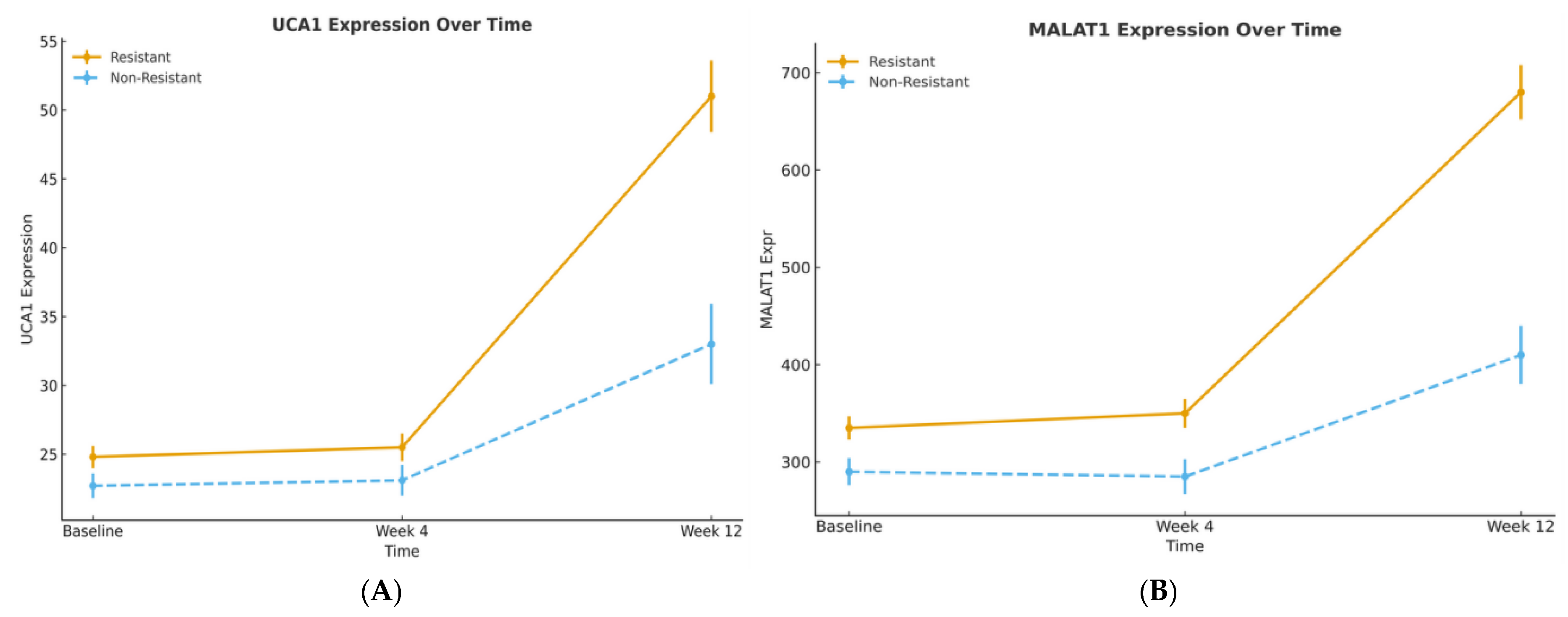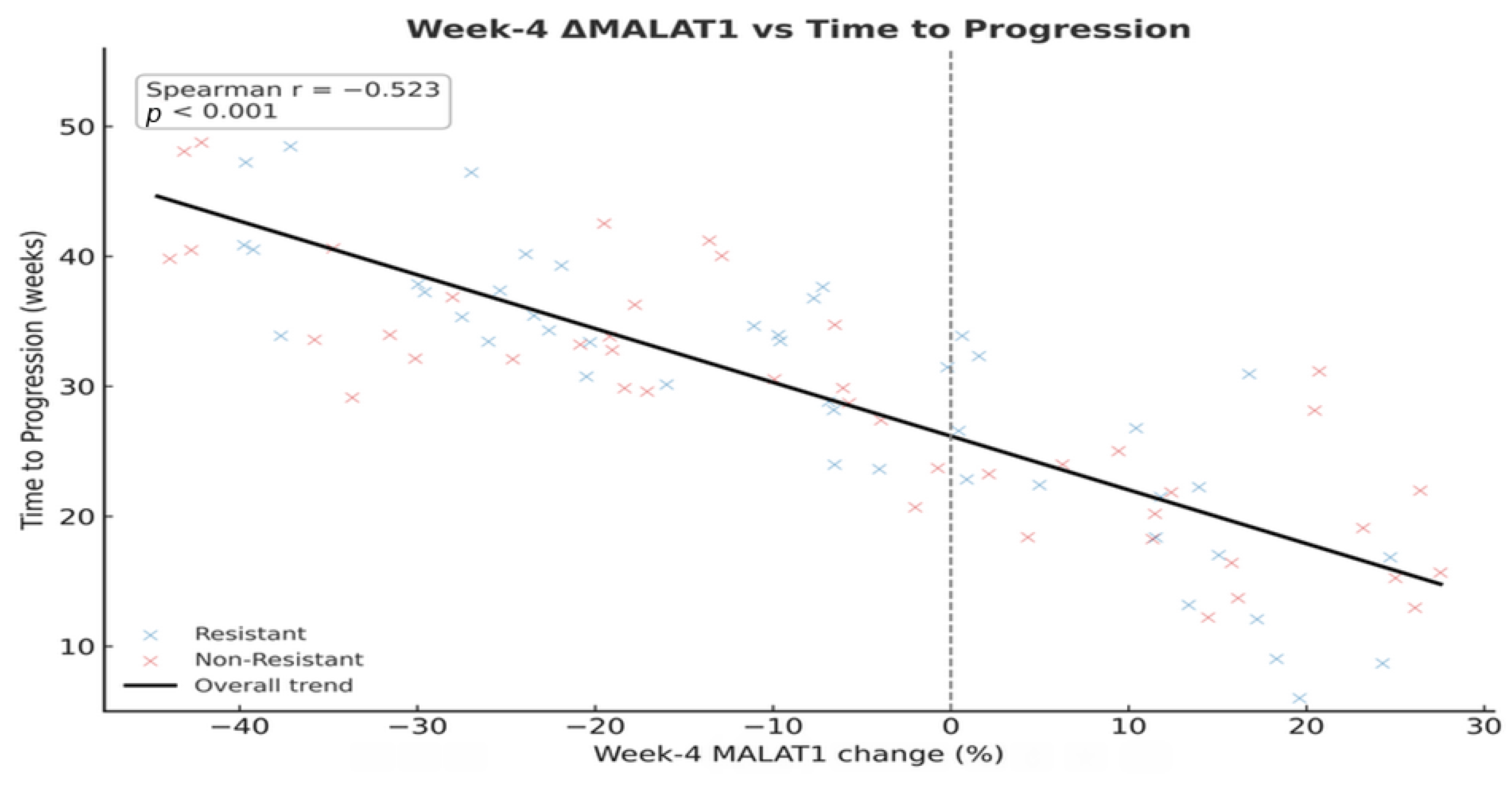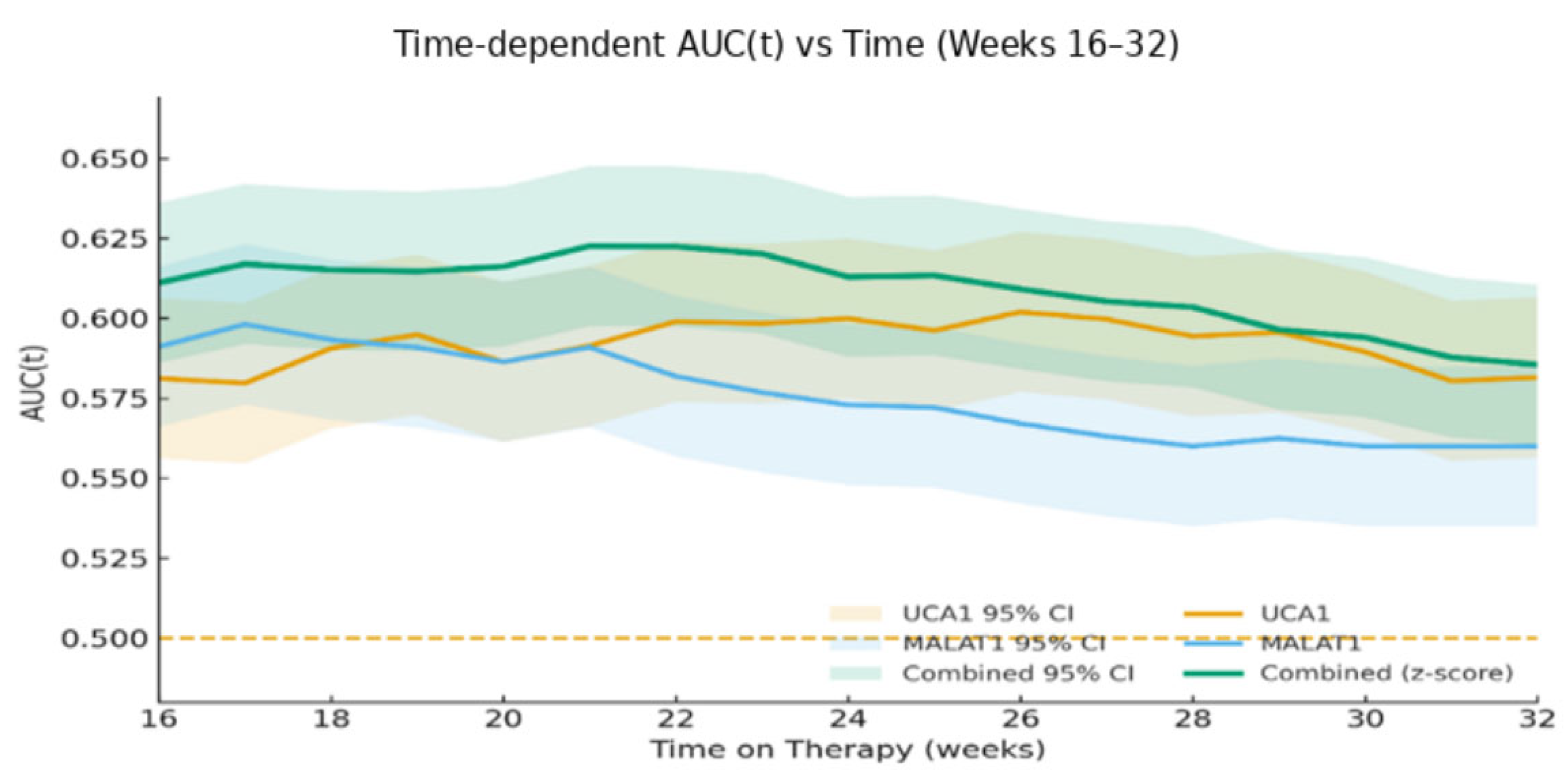 14]. More critically, our study advances this concept from diagnosis to dynamic prediction. We found that the discriminative power of these biomarkers changes over time, with Week 12 changes achieving an outstanding AUC of 0.881 for predicting acquired resistance. This progression from modest baseline AUCs to late-stage predictive performance underscores a fundamental principle: the biological information captured by these lncRNAs becomes most potent when measured serially, reflecting the tumor’s adaptive response to therapeutic pressure.