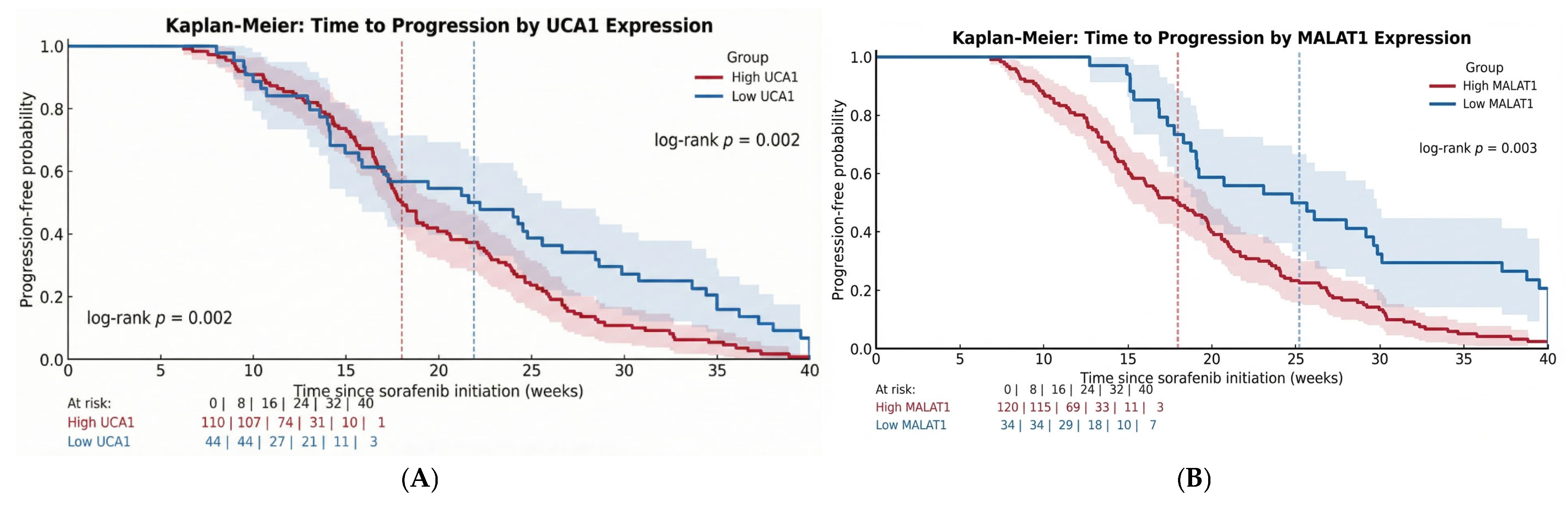 Third, and fundamentally, our work identifies a strong association but cannot prove causation. We show that high levels of UCA1 and MALAT1 predict poor outcomes, but we cannot definitively state that they are the direct mechanical drivers of resistance. Other patient-specific factors may influence them, which we could not fully control for, such as underlying liver inflammation. While this clinical association is powerfully suggestive, it now requires validation through functional laboratory experiments such as knocking down these lncRNAs in cell models to establish a true cause-and-effect relationship. Also, there is a statistical limitation in the small “low-expression” group (n = 34) compared to the “high-expression” group (n = 120). This can reduce the precision of the estimates for the low group (wider confidence intervals).