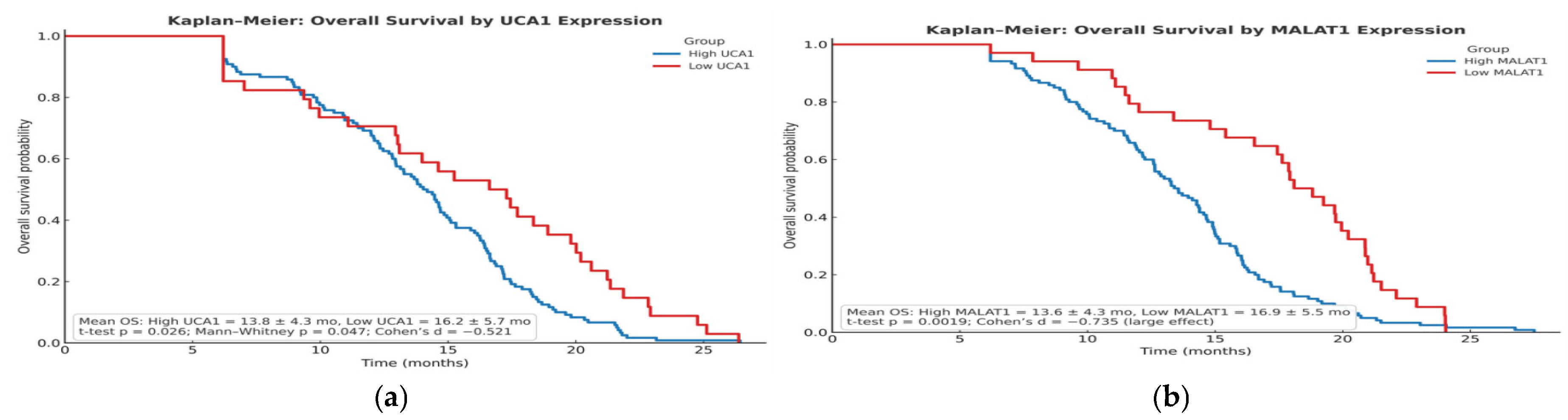 Patients were stratified into ‘High’ and ‘Low’ expression groups using pre-validated prognostic cut-offs: UCA1 > 12.0 and MALAT1 > 87.76 (relative expression units, calculated using the 2