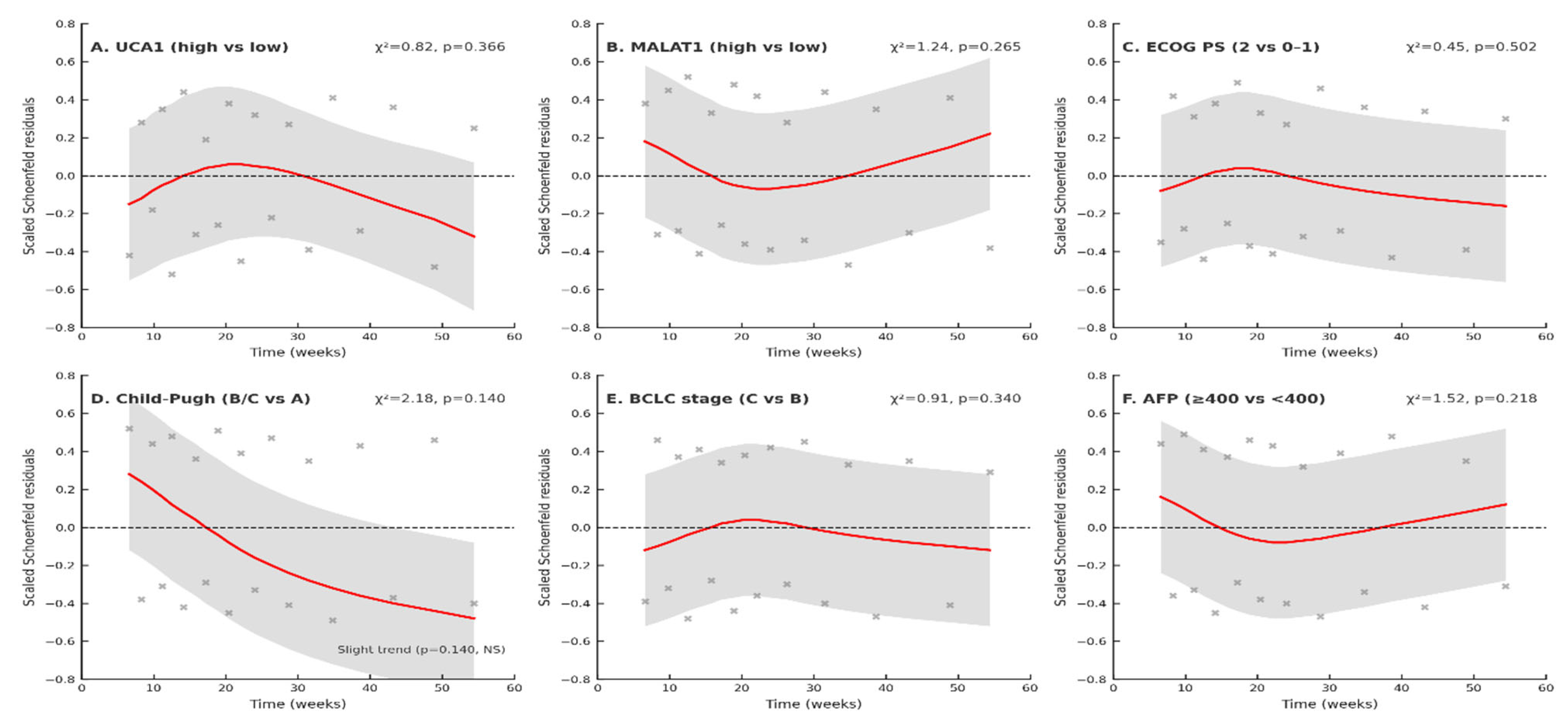 Notably, both UCA1 and MALAT1 retained independent prognostic significance after adjustment for established clinical predictors, including Child-Pugh class, BCLC stage, and AFP, after multiple testing corrections and validation of Cox model assumptions, underscoring the reliability of these biomarkers for clinical therapeutic and prognostic purposes in HCC.